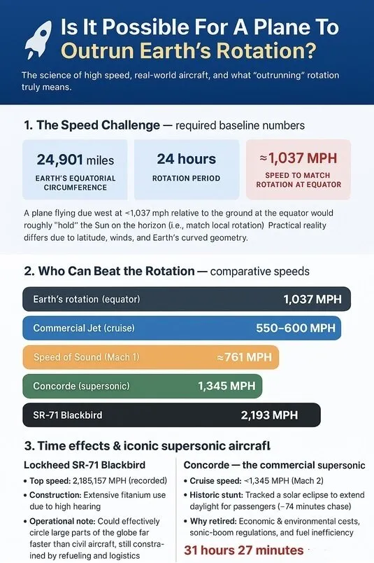 حتی هواپیماهای تجاری برای پیشی گرفتن از چرخش زمین به سرعت مدنظر نزدیک هم نمی‌شوند. سرعت متوسط یک جت تجاری در ارتفاع کروز بین ۸۸۵ تا ۹۶۵ کیلومتر بر ساعت است؛ یعنی حتی نصف سرعتی که برای هم‌تراز شدن یا پیشی گرفتن از مسیر یک روز هم نیست. برای اینکه واقعاً بتوانید از سرعت چرخش زمین پیشی بگیرید، به یک هواپیمای مافوق صوت نیاز دارید و تنها تعداد کمی هواپیما در جهان وجود دارند که می‌توانند به این سرعت دست بیابند.