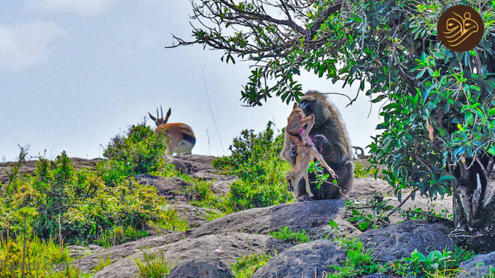 این لحظهای است که یک بابون نه یک بلکه به دو غزال تامپسون بیدفاع در حیات وحش آفریقا حمله میکند.