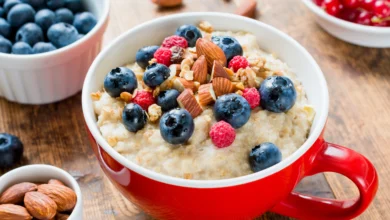 صبحانه ۲/۱تا ۱ پیمانه (۴۰-۸۰ گرم) اوتمیل، همراه با میوهها و مغزها