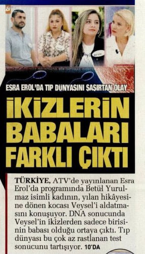 به گزارش عصرترکیه به نقل از روزنامه صباح، در برنامه ای در شبکه ” آ ت و” ترکیه که اسرا ارول مجری معروف آن را اجرا می کند، موردی از دعوا بر سر حضانت فرزندان دوقلوی یک خانواده پیش آمد که پس از آزمایشهای ژنتیک از این دو فرزند دوقلو نتیجه ای به دست آمد که بسیار عجیب و شگفت انگیز بود.