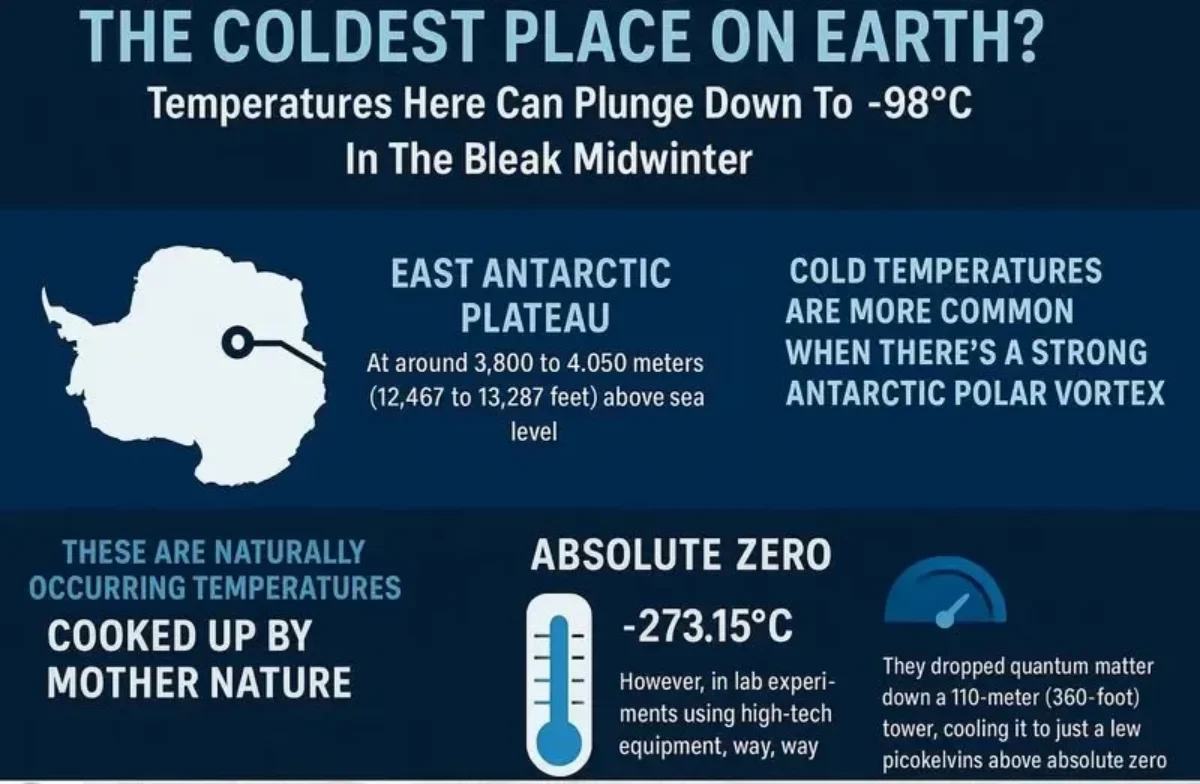 در حالی‌ که رکورد رسمی سردترین نقطهٔ زمین در ایستگاه وُستوک با دمای ۸۹.۲- درجه ثبت شده، ماهواره‌ها نشان داده‌اند که بخش‌هایی از فلات شرق قطب جنوب حتی سردترند؛ جایی که دما در تاریکی مطلق زمستان به مرز ۹۸- درجه سانتی‌گراد می‌رسد؛نزدیک‌ترین چیزی که طبیعت تاکنون به «صفر مطلق» تجربه کرده است.