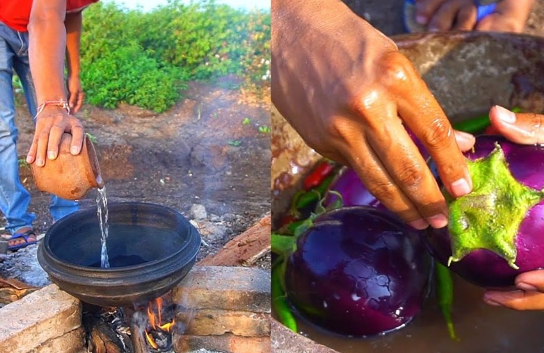 غذاهای روستایی: پخت یک غذای متفاوت با بادمجان کبابی و برنج توسط کشاورز هندی (فیلم)