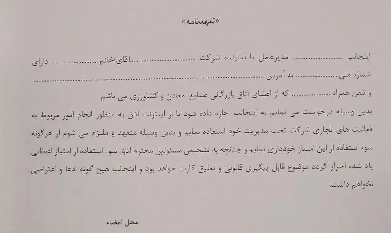 اعضای اتاق بازرگانی با در دست داشتن کارت عضویت، کارت ملی و یک برگ تعهدنامه در صف ایستاده اند تا بتوانند نیم ساعت به اینترنت جهانی دسترسی داشته باشند! تصویر زیر متن تعهدنامه برای استفاده نیم ساعته تجار از اینترنت را نشان می دهد: