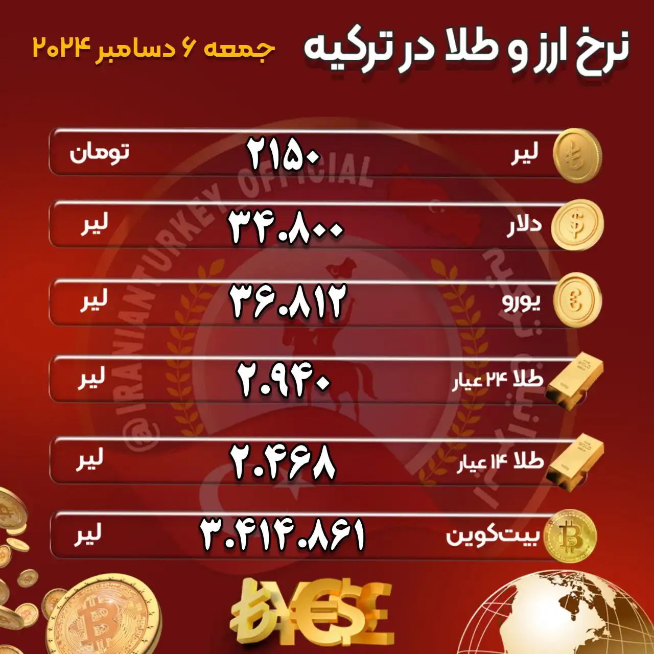 نرخ امروز طلا و ارز در بازار استانبول ( 6 دسامبر 2024)