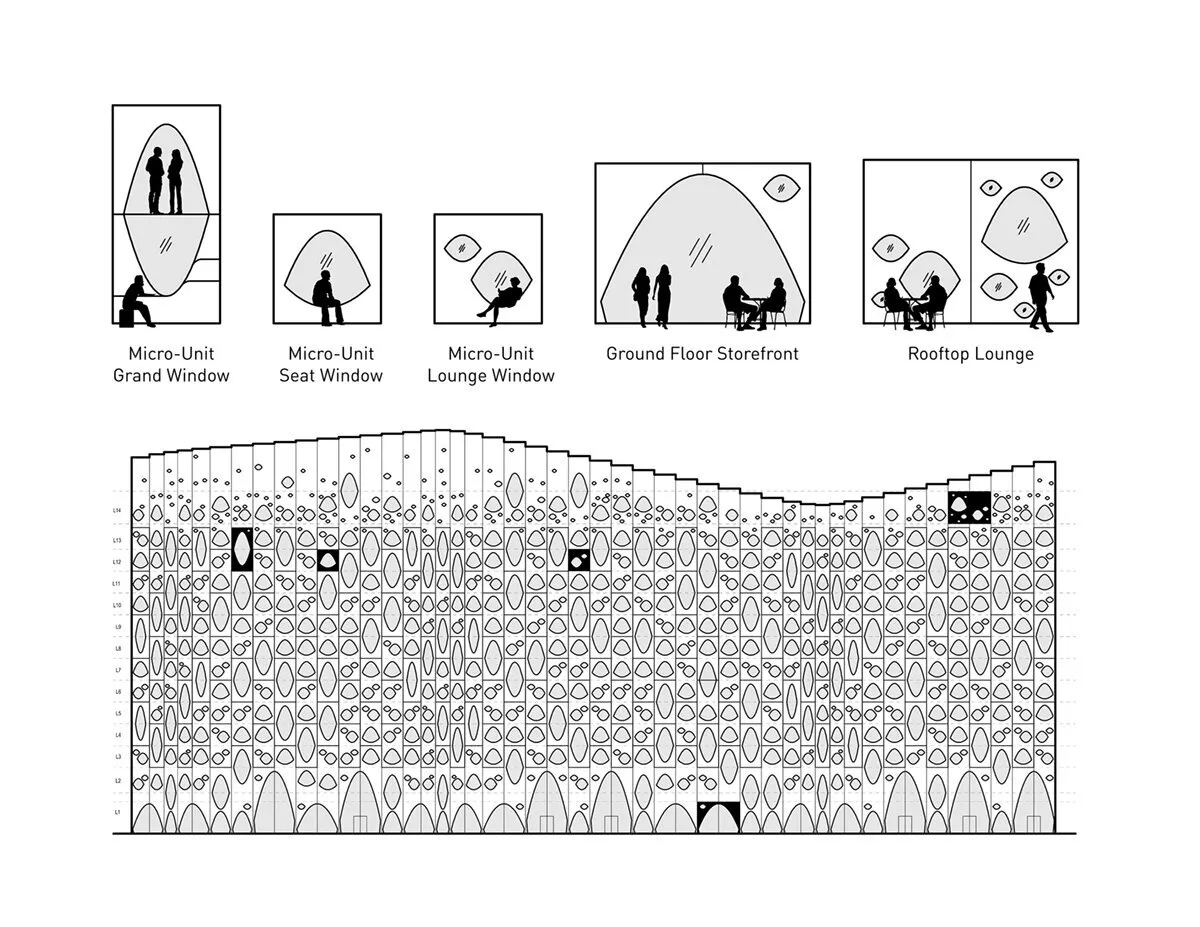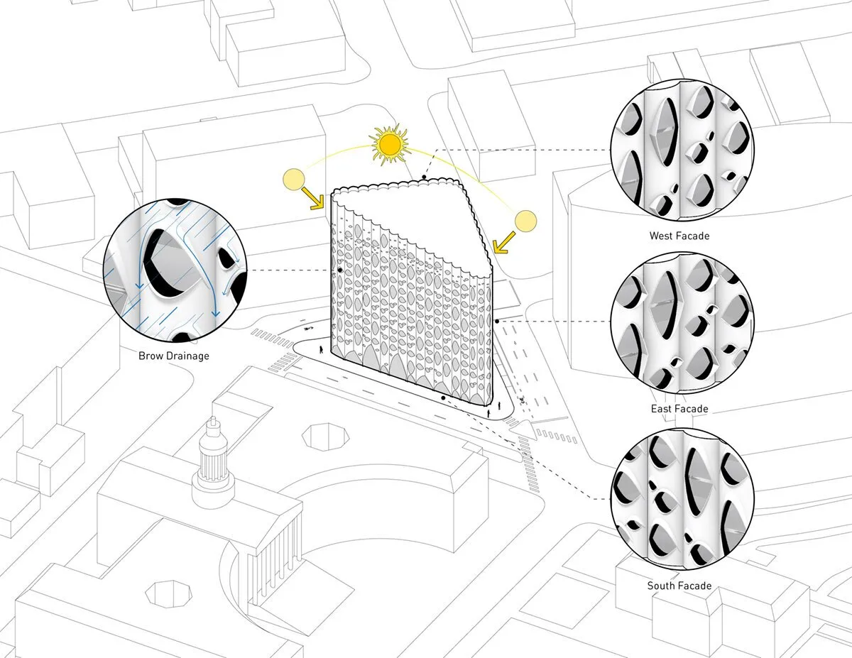 معماری  هتل  با هدف یادآوری طبیعت به مردم طراحی شده است. این ساختمان توسط معمار ژان گنگ و شرکت او به نام استودیو گنگ طراحی شده است. به گفته پراین، گنگ برای الهام گرفتن، پیاده روی های طولانی در کوه های کلرادو انجام داده است. نمای منحنی و سایه بان دار حاصل از این طراحی، پنجره ها را عایق بندی می کند تا در تابستان از ورود آفتاب داغ و در زمستان از خروج هوای گرم جلوگیری کند.