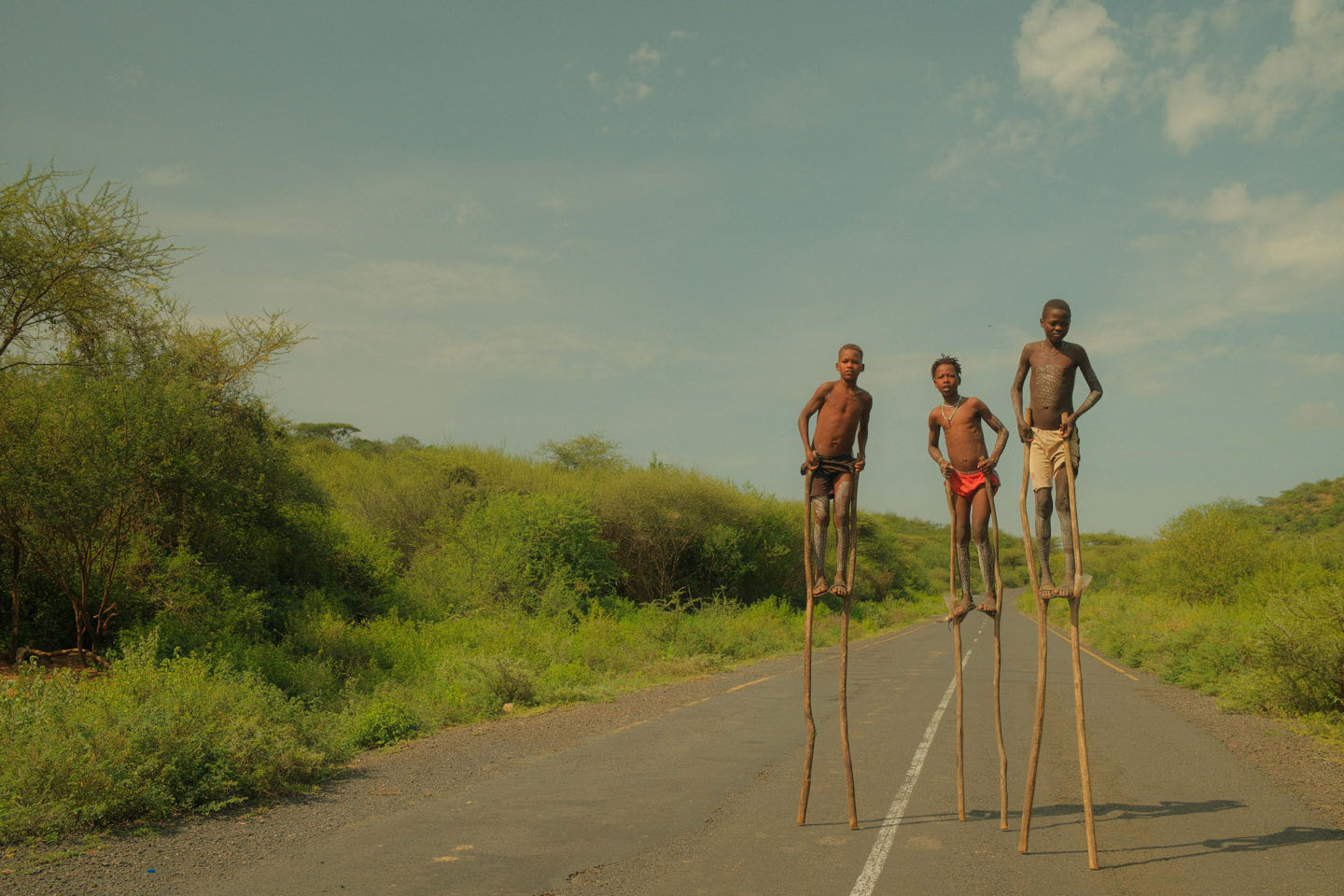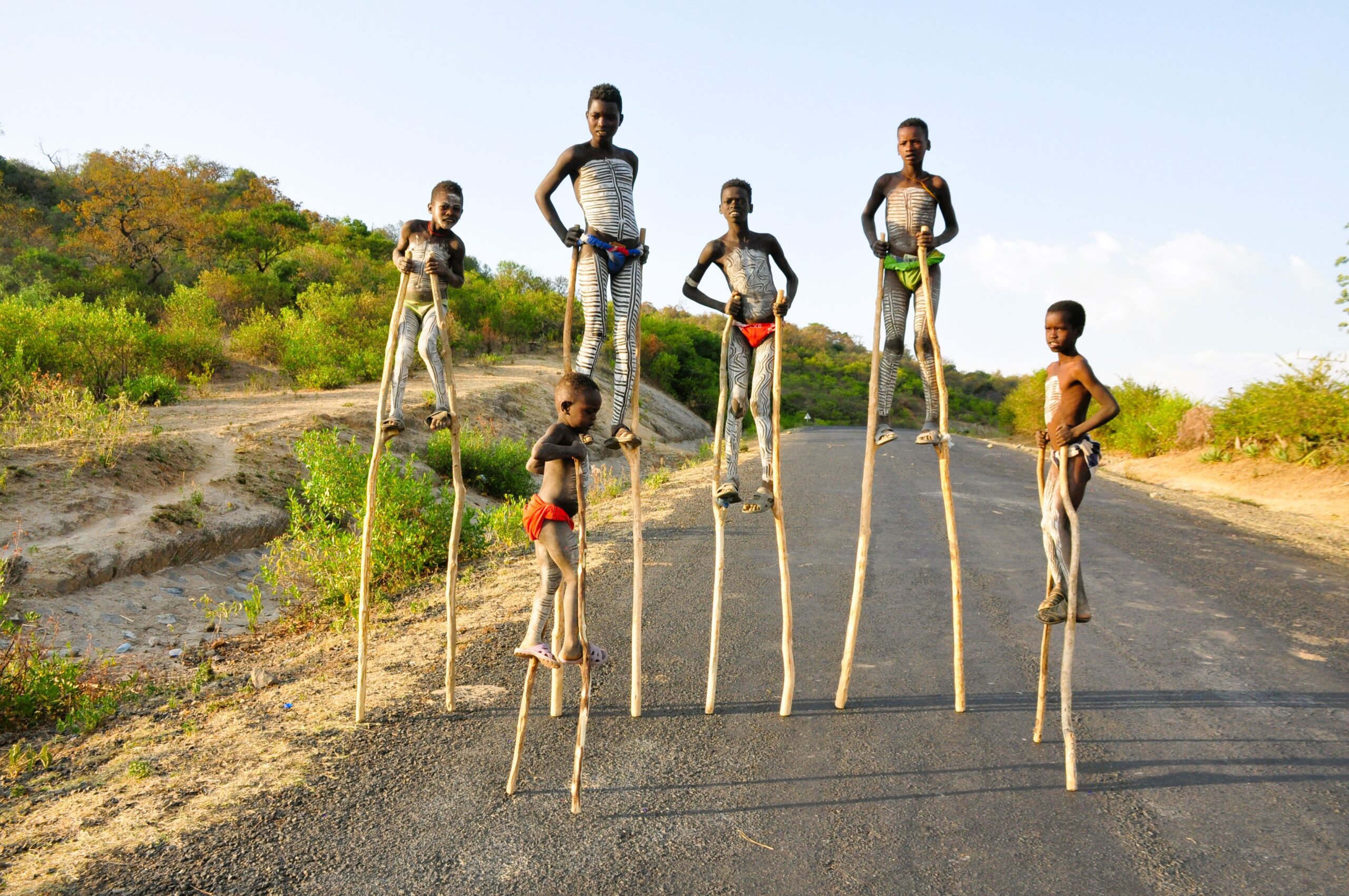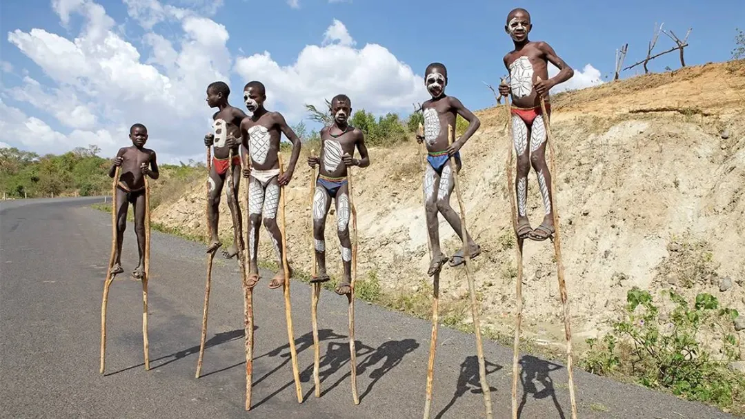 اعضای قبیله بانا در اتیوپی در حال راه رفتن با پایههای چوبی بلند.