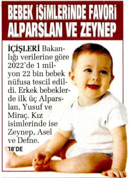 به گزارش عصر ترکیه به نقل از به نوشته نشریه صباح ترکیه، بر اساس اطلاعات وزارت کشور ترکیه در سال ۲۰۲۲ در مجموع یک میلیون و ۲۲ هزار شناسنامه برای تازه متولدین صادر شد. از میان اسامیی که خانواده ها برای نوزادان خود گذاشته اند چند اسم در صدر قرار گرفت.