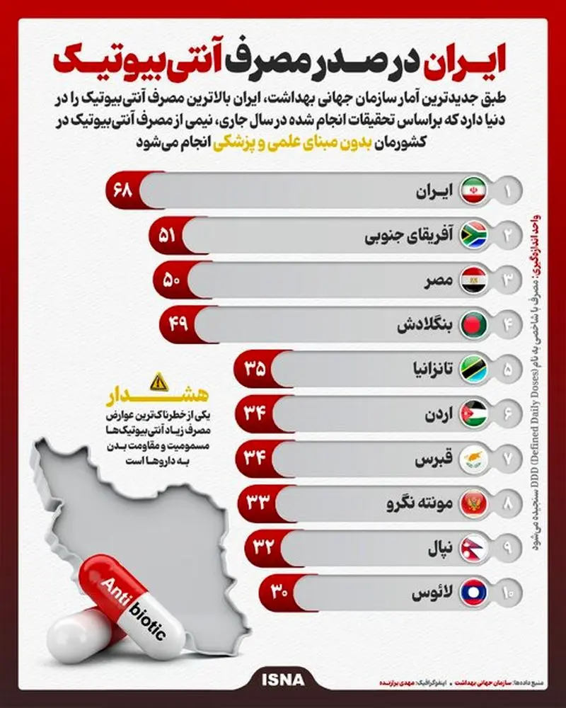 طبق جدیدترین آمار سازمان جهانی بهداشت، ایران بالاترین مصرف آنتیبیوتیک را در دنیا دارد که براساس تحقیقات انجام شده در سال جاری، نیمی از مصرف آنتیبیوتیک در کشورمان بدون مبنای علمی و پزشکی انجام میشود.
