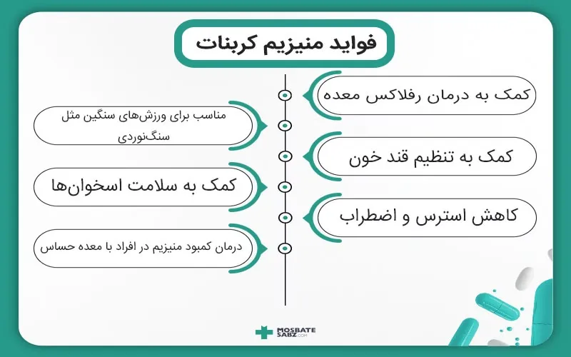 جذب منیزیم کربنات در بدن کم است اما اثرگذاری آن نسبت به مکملی مانند منیزیم اکساید بهتر است. از همین رو، اگر فردی با معده حساس دچار کمبود شدید منیزیم باشد، ممکن است قرص جویدنی منیزیم کربنات یا پودر آن، برای او تجویز شود. از مصرف خودسرانه منیزیم کربنات بپرهیزید.