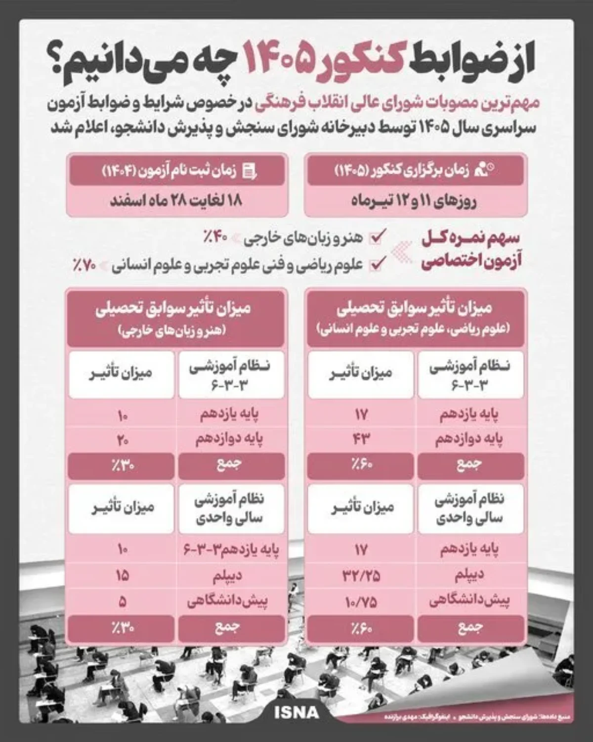 مهم‌ترین مصوبات شورای عالی انقلاب فرهنگی در خصوص شرایط و ضوابط آزمون سراسری سال ۱۴۰۵ توسط دبیرخانه شورای سنجش و پذیرش دانشجو، اعلام شد. ثبت‌نام آزمون سراسری سال ۱۴۰۵ از ۱۸ اسفندماه جاری آغاز می‌شود و ۲۸ این ماه به اتمام می‌رسد. همچنین کنکور سال ۱۴۰۵ در روز‌های ۱۱ و ۱۲ تیرماه برگزار خواهد شد.