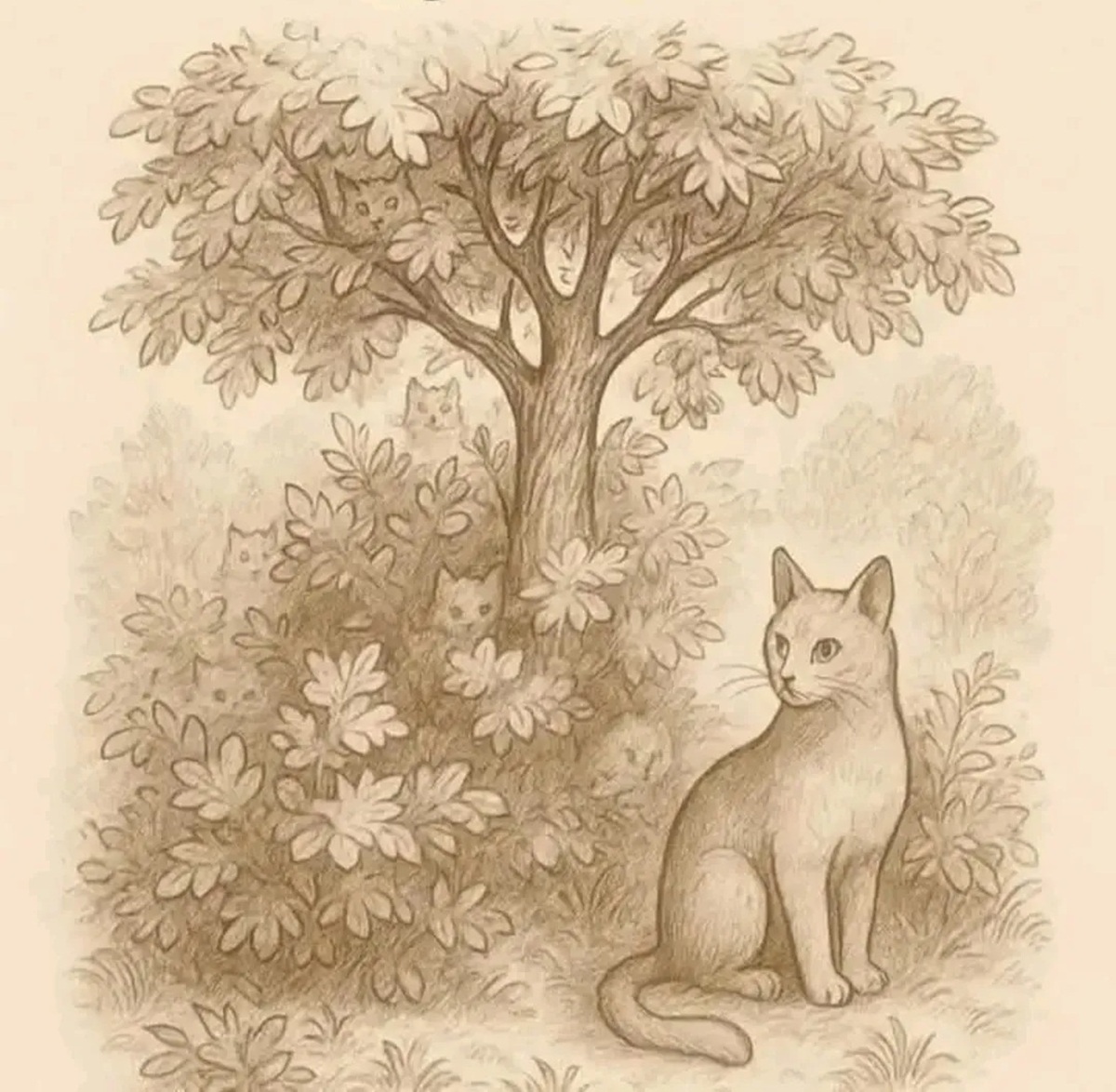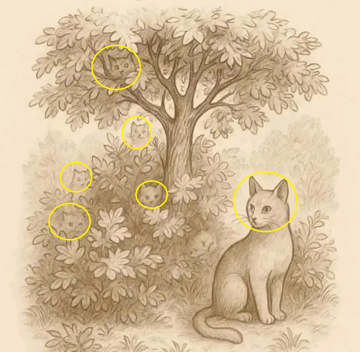 این تصویر توسط یکی از کاربران در فیسبوک منتشر شد. در نگاه اول، فقط یک گربه آرام زیر درخت دیده میشود. اما با کمی دقت متوجه میشوید که در لابهلای برگها و بوتههای اطراف، صورتهای دیگری از گربهها نیز پنهان شدهاند. همین باعث شده تا هزاران کاربر در بخش نظرات تلاش کنند تعداد دقیق گربهها را حدس بزنند.
