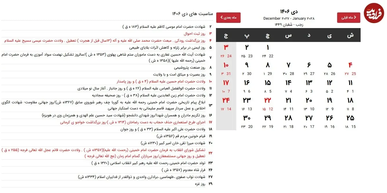 تعطیلات و مناسبتهای ماه دی ۱۴۰۶