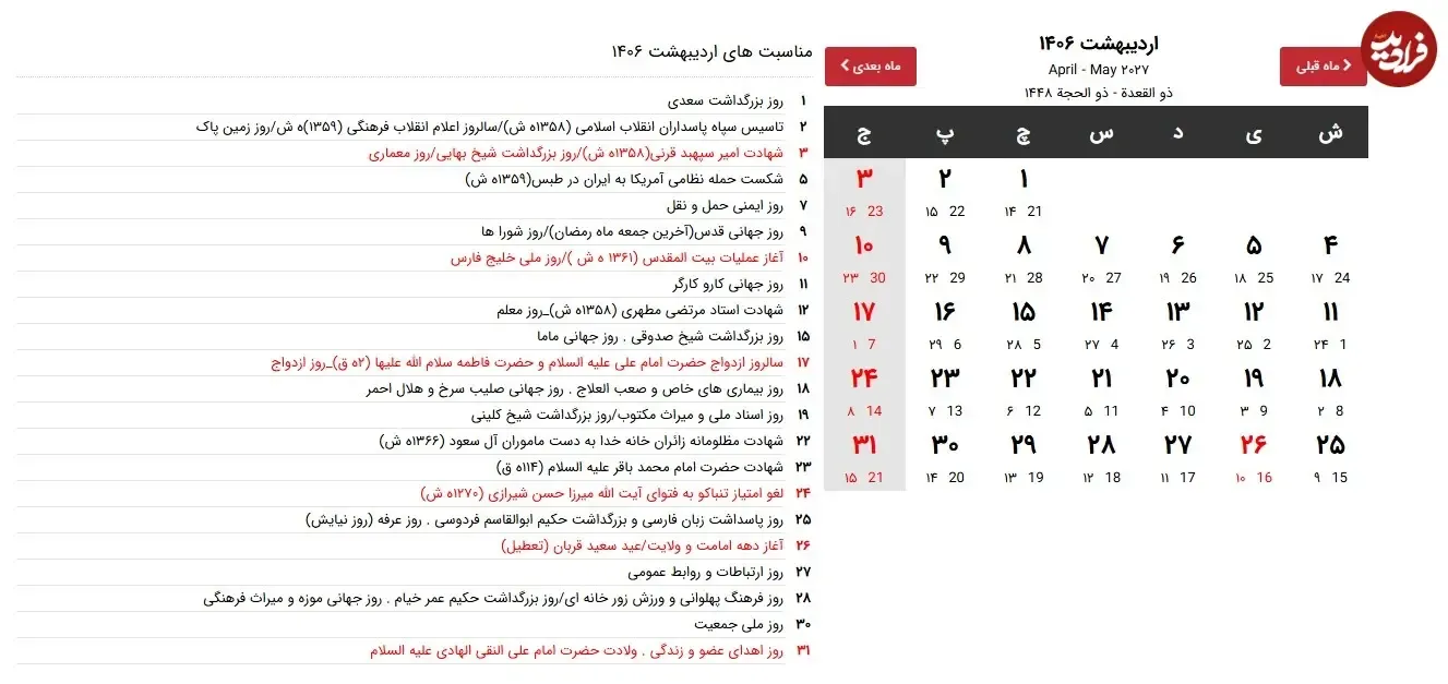 تعطیلات و مناسبتهای ماه اردیبهشت ۱۴۰۶