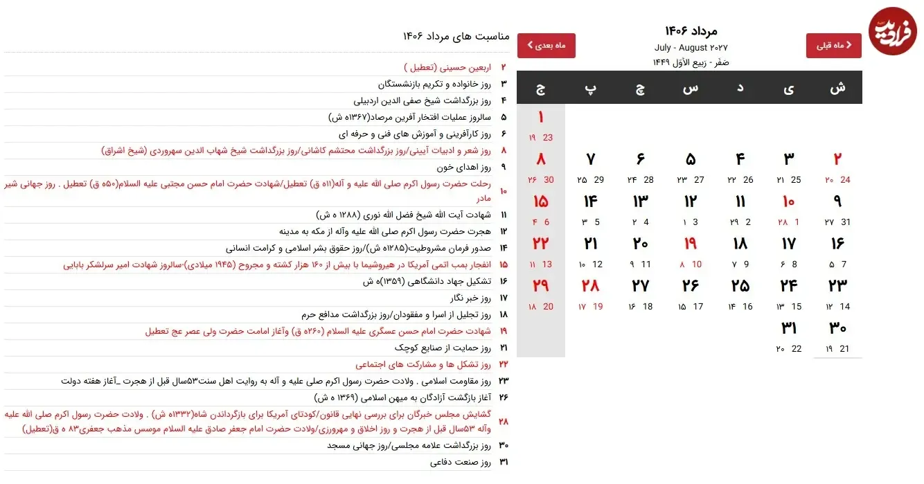 تعطیلات و مناسبتهای ماه مرداد ۱۴۰۶