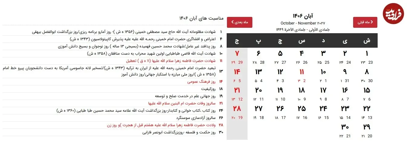 تعطیلات و مناسبتهای ماه آبان ۱۴۰۶