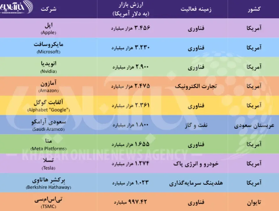 همانطور که در جدول بالا میبینیم غولهای فناوری آمریکایی شامل اپل با ارزش بازار جهانی ۳.۴۵۶ هزار میلیارد دلار، مایکروسافت با ارزش جهانی ۳.۲۳۰ هزار میلیارد دلار و انویدیا با ارزش جهانی ۲.۹۰۰ به ترتیب جایگاه اول تا سوم را به خود اختصاص دادهاند.