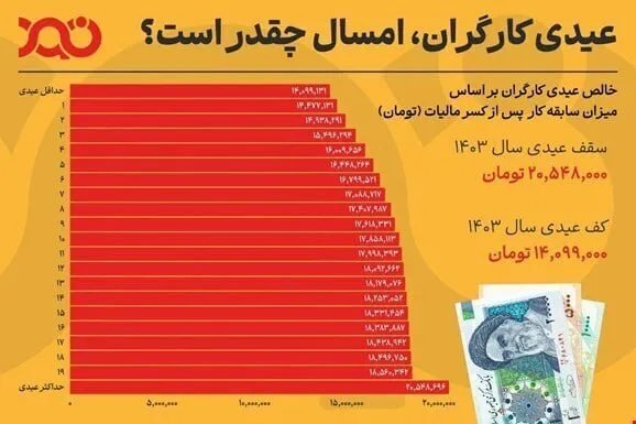 امسال پایه حداقل دستمزد کارگران ۷ میلیون و ۱۰۰ هزار تومان بود و بر این اساس حداقل عیدی نباید کمتر از ۱۴ میلیون و ۲۰۰ هزار تومان باشد. از سوی دیگر حداکثر عیدی ۲۱ میلیون و ۳۰۰ هزار تومان خواهد بود.