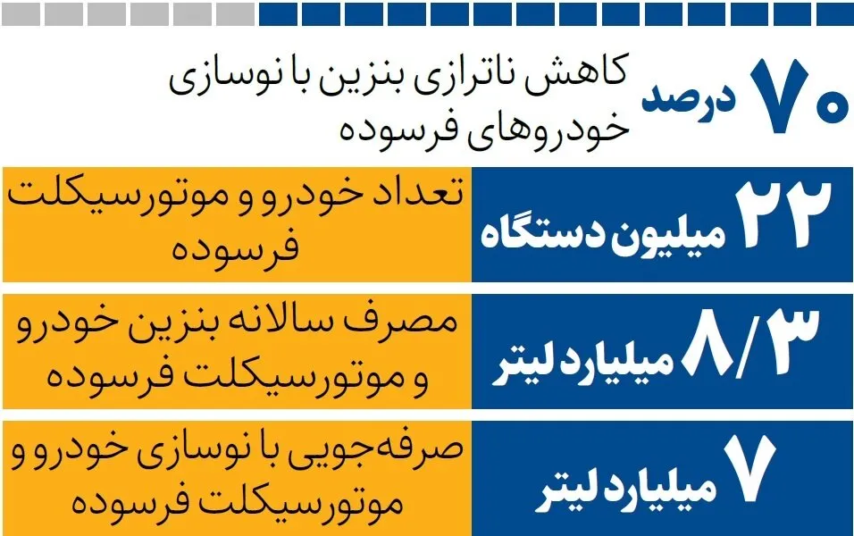 از سوی دیگر تا امروز نزدیک به ۲.۵ میلیون خودرو از چرخه ناوگان حملونقل خارج و اسقاط شده و نزدیک به ۲۴ میلیون خودرو سواری و وانت در کشور در حال تردد هستند. طی سالهای ۱۴۰۳ و ۱۴۰۴ تاکنون نزدیک به ۱.۵ میلیارد لیتر بنزین ناشی از اسقاط ۵۰۰ هزار دستگاه خودرو صرفهجویی در مصرف بنزین و نزدیک به ۸ درصد کاهش انتشار گازهای آلاینده و گلخانهای حاصل شده و لازم است جهت افزایش پایداری این فرایند صرفهجویی ارزی ناشی از صرفهجویی مصرف در چرخه اسقاط و نوسازی ناوگان سرمایهگذاری شود که تا امروز اینگونه نبوده است.
