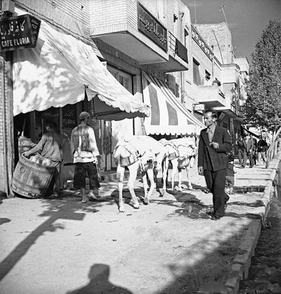 پیاده روی خیابان نادری، تابلوی داروخانه فروزنده و در کنارش کافه فلوریا به خوبی دیده می شوند. بشکه ها هم مخصوص حمل و ساخت بستنی بود.