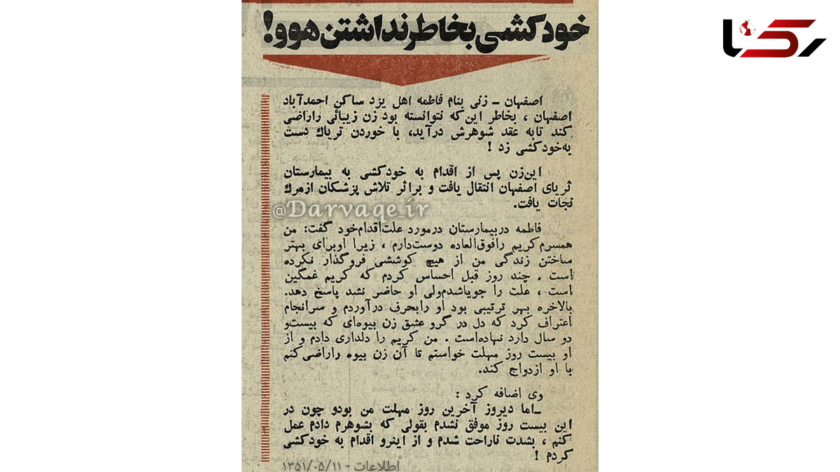 به گزارش رکنا، در سال ۱۳۵۱، زنی به نام فاطمه به دلیل ناتوانی در راضی کردن زنی دیگر برای ازدواج با شوهرش، دست به خودکشی با خوردن تریاک زد.