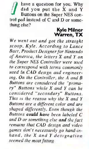 راز این حروف به دنیای طراحی با کامپیوتر یا CAD بازمیگردد. طراحان دسته سوپر نینتندو میخواستند دکمههای اصلی و فرعی را از هم متمایز کنند. در نرمافزارهای CAD آن زمان از حروف A و B برای نشانهگذاری عناصر اصلی و از X و Y برای عناصر ثانویه استفاده میشد. به همین دلیل این طراحی دسته بازی برای همیشه ماندگار شد.