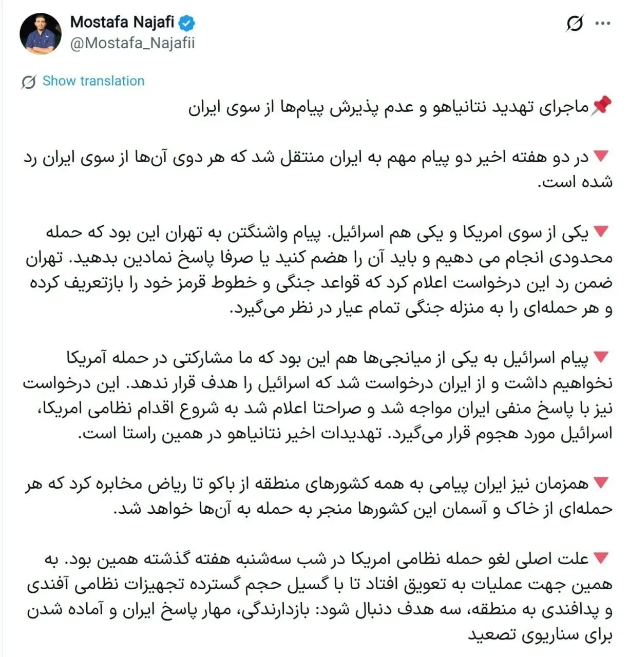 پیام واشنگتن به تهران این بود که حمله محدودی انجام می دهیم و باید آن را هضم کنید یا صرفا پاسخ نمادین بدهید. تهران ضمن رد این درخواست اعلام‌ کرد که قواعد جنگی و خطوط قرمز خود را بازتعریف کرده و هر حمله‌ای را به منزله جنگی تمام عیار در نظر می‌گیرد.