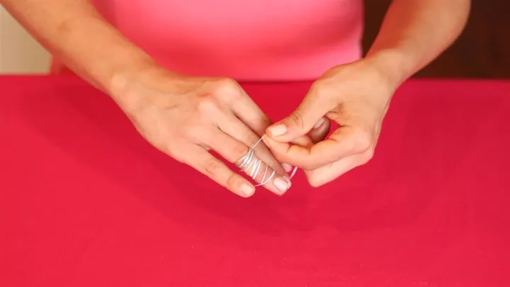 بعد از این که انگشت به طور کامل با نخ پیچیده شد، به سر دیگر نخ (همان سر اول که در کف دست قرار دارد) برگردید. حالا این سر نخ را به آرامی به سمت نوک انگشت بکشید. همزمان که نخ را میکشید، انگشتر به تدریج روی لایههای نخ شروع به حرکت میکند و یکی یکی پیچها را باز میکند.