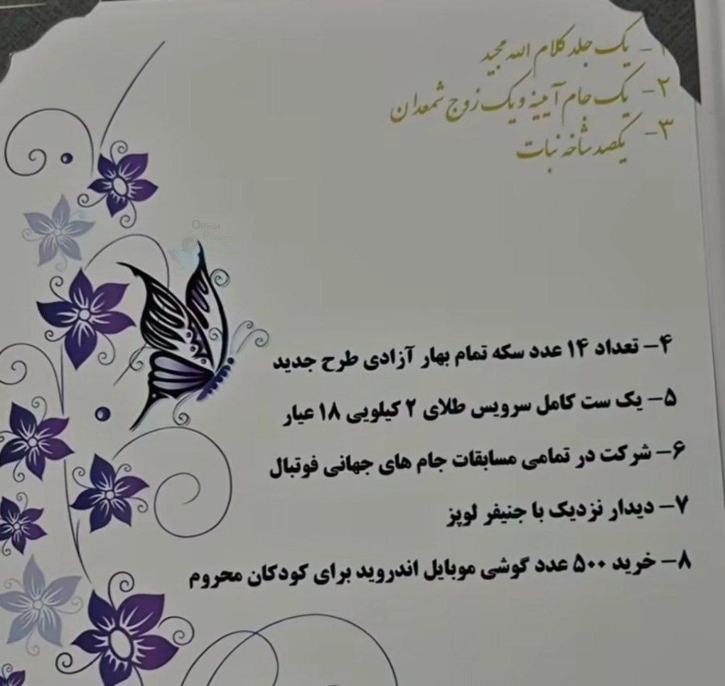 در میان بندهای این مهریه، مواردی مانند یک ست کامل طلا، خرید گوشی برای کودکان محروم، دیدار نزدیک با یک چهره خارجی و حتی شرکت در تمامی مسابقات جام جهانی فوتبال دیده میشود.