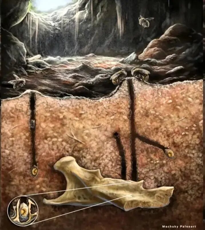 با گذشت زمان، این تودههای استخوان با رسوبات ورودی از خارج غار مدفون شدند و چندین نسل از زنبورهای حفرهساز بعدها از این فرصت بهره بردند، حتی بااینکه معمولاً لانههای خود را در فضای باز میسازند.
