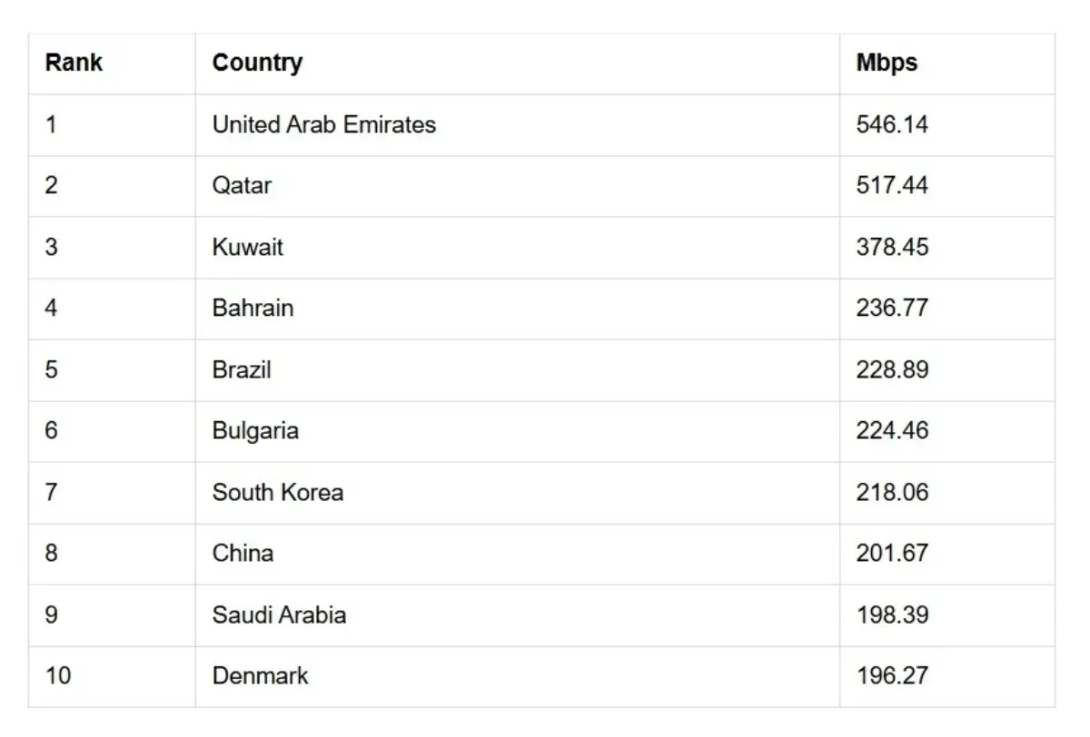 طبق جدیدترین دادههای Speedtest Global Index برای ژوئن و ژوئیه 2025، امارات متحده عربی با میانگین سرعت دانلود موبایل حدود 546 مگابیت بر ثانیه، سریع ترین اینترنت موبایل جهان را دارد.