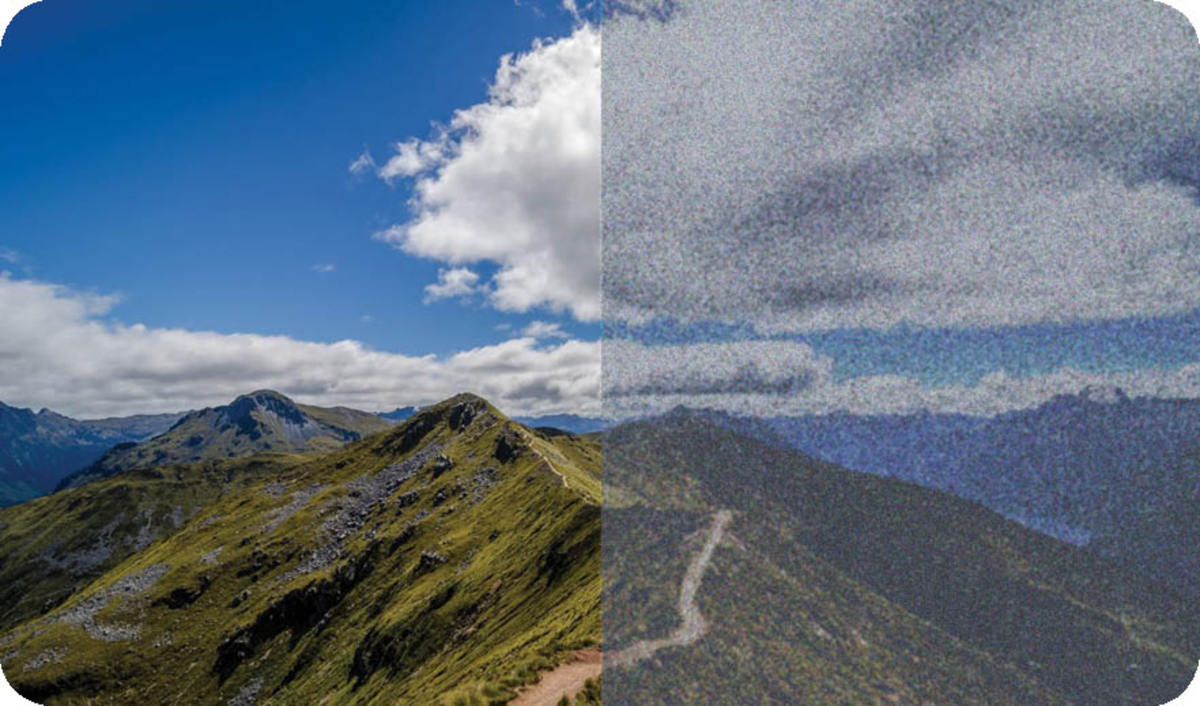 مقایسه دید افراد عادی (سمت چپ) و افراد مبتلا به سندرم برف بصری (سمت راست).