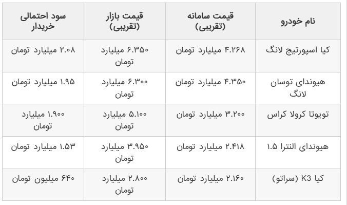 بررسی اختلاف قیمت سامانه یکپارچه و بازار آزاد نشان میدهد خریداران خودروهای وارداتی در این دوره شانس برنده شدن یک سود نجومی تا ۲ میلیارد تومان را دارند. کیا اسپورتیج و هیوندای توسان در صدر جدول سوددهی قرار گرفتند.