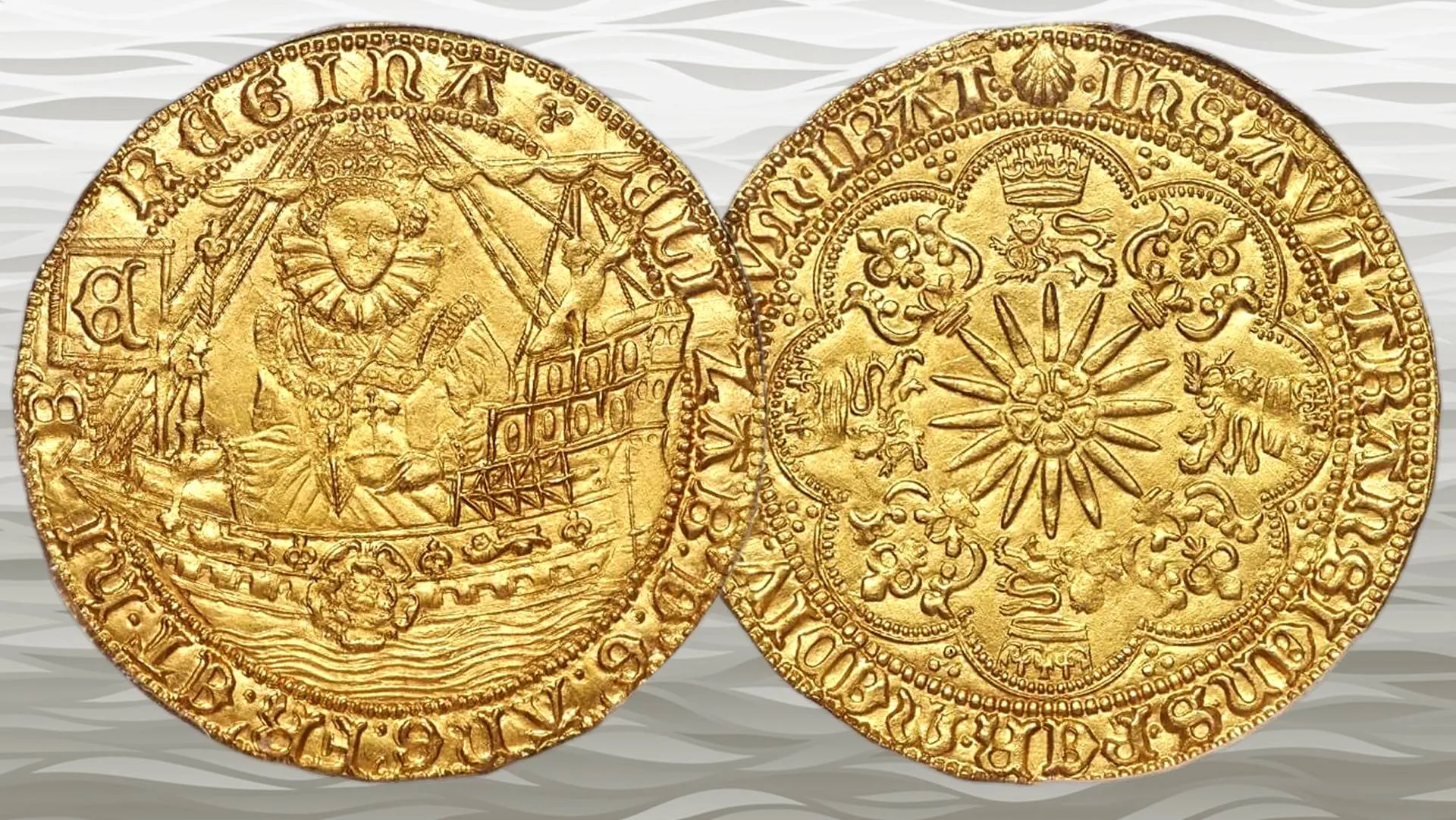 طراحی این سکه به شکلی هنرمندانه تسلط انگلستان بر دریاها را در آستانه استعمار آمریکا و شکست ناوگان اسپانیا در سال ۱۵۸۸ به تصویر میکشد. روی سکه تصویری از الیزابت اول دیده میشود که با لباس فاخر و عصای سلطنتی بر عرشه یک کشتی ایستاده است؛ نمادی آشکار از اقتدار دریایی بریتانیا در آن دوران. در سوی دیگر سکه، صلیبی با طرحهای گلدار در مرکز، گل رزی بر خورشید تابان و شیرهای تاجدار نقش بسته است که همگی با ظرافت خاصی حکاکی شدهاند. دورتادور این نقوش متنی لاتین برگرفته از انجیل لوقا (۴:۳۰) با مضمون “اما او از میان آنها گذشت و به راه خود رفت” به چشم میخورد که طبق اعلام موزه سلطنتی ضرب سکه، روی بسیاری از سکههای آن دوره نقش میبست.