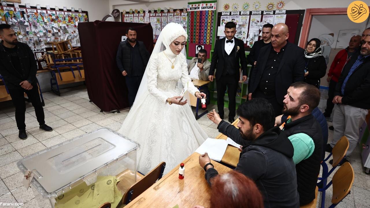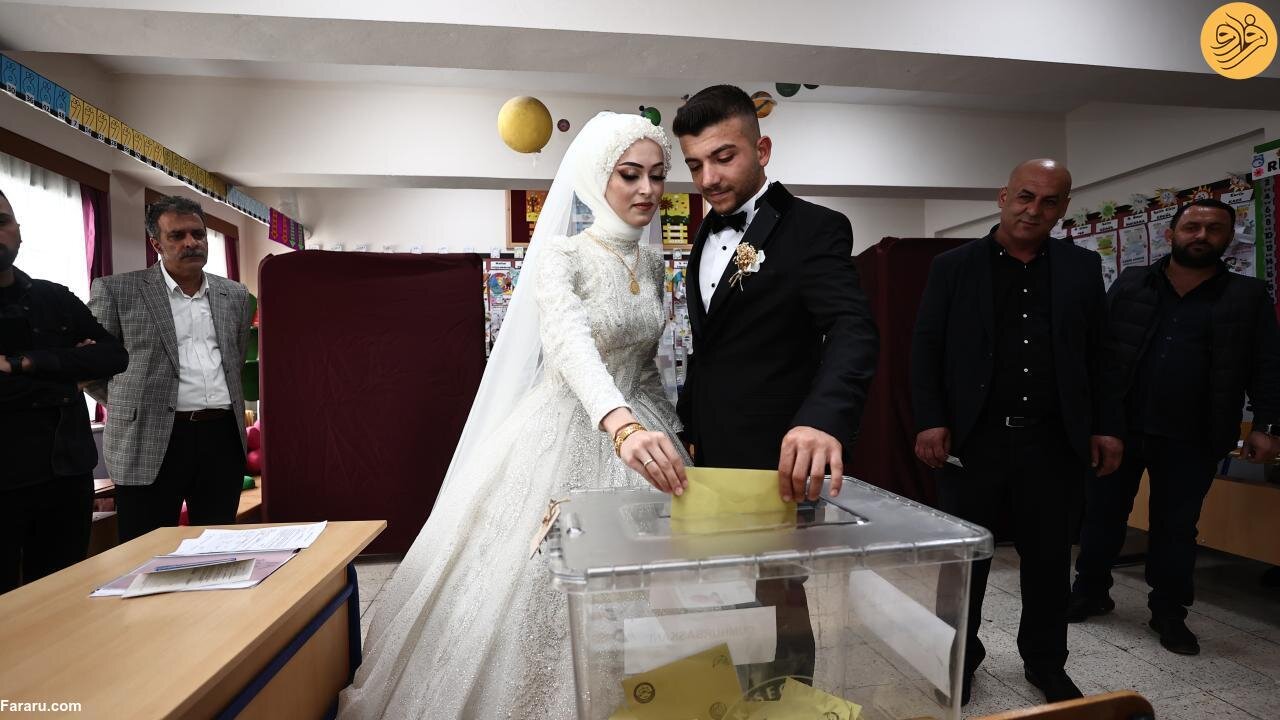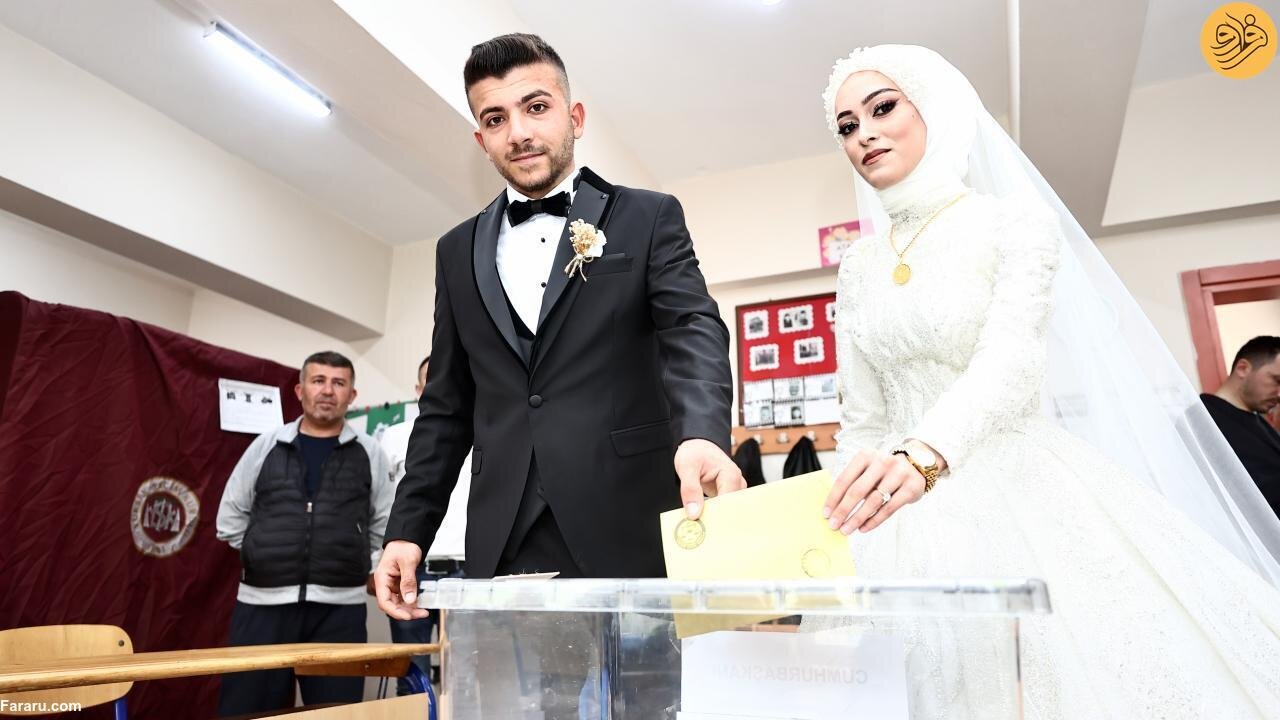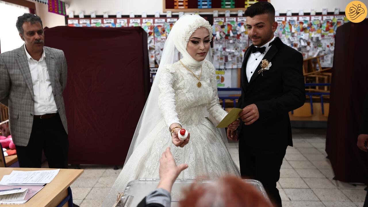 عروس و داماد ترکیهای که قرار بود در منطقه دوزجه جشن عروسی خود را برگزار کنند پیش از برگزاری مراسم با لباس مراسم خود برای شرکت در دور دوم انتخابات ریاست جمهوری ترکیه پای صندوقهای رای رفتند.