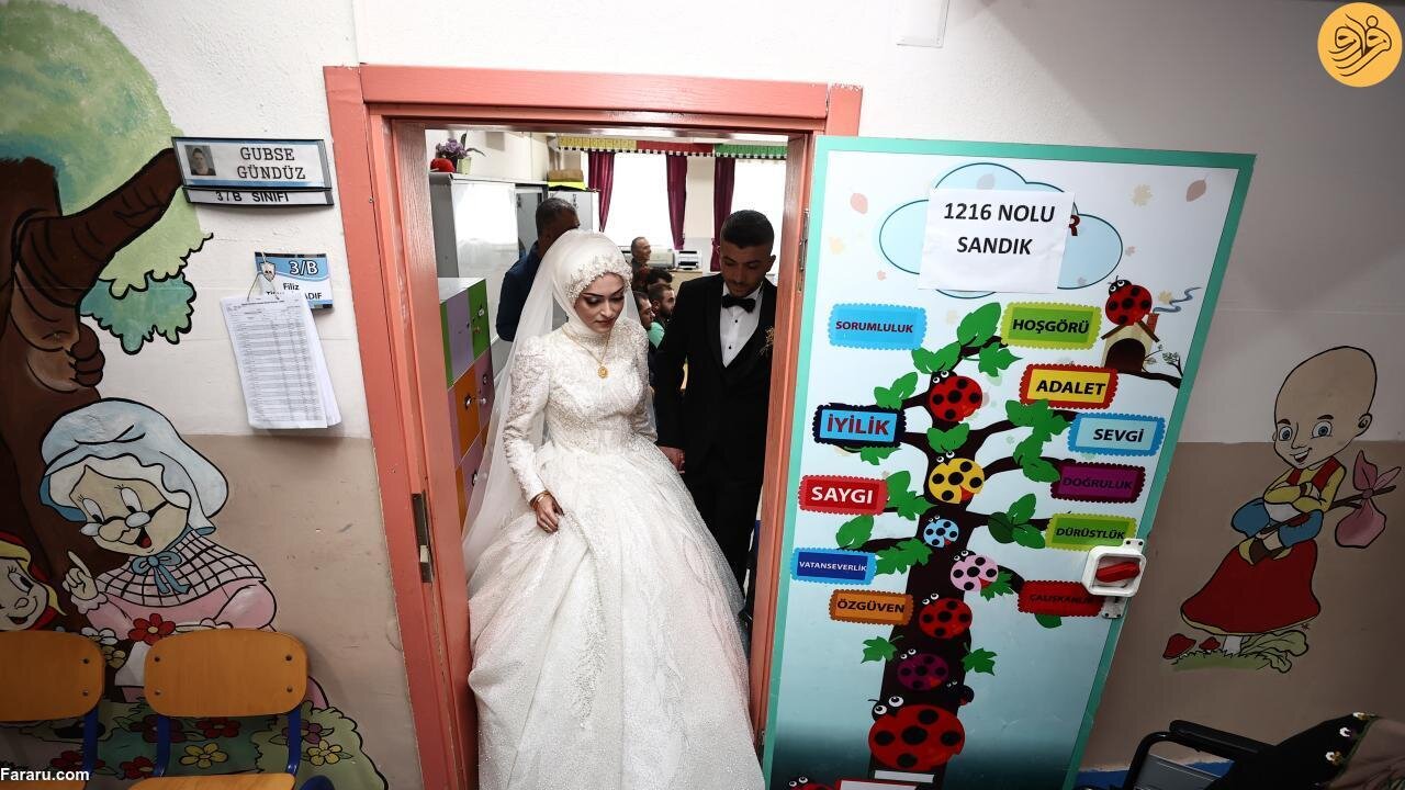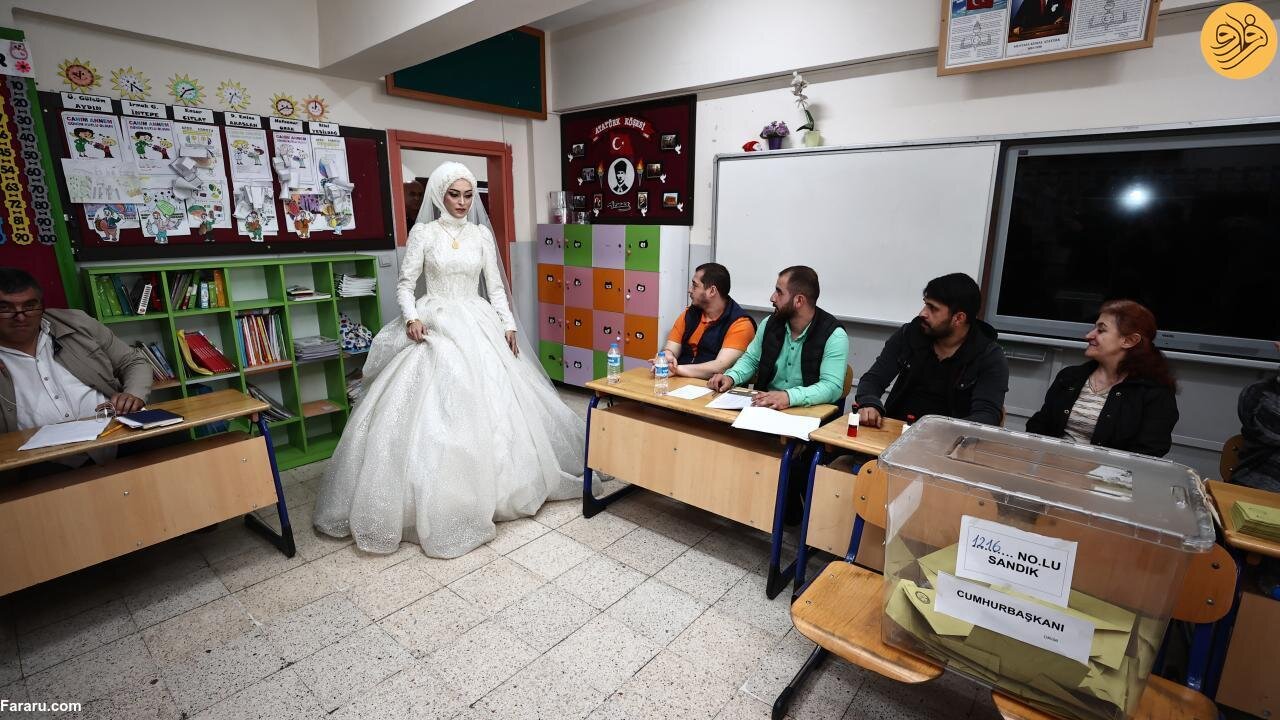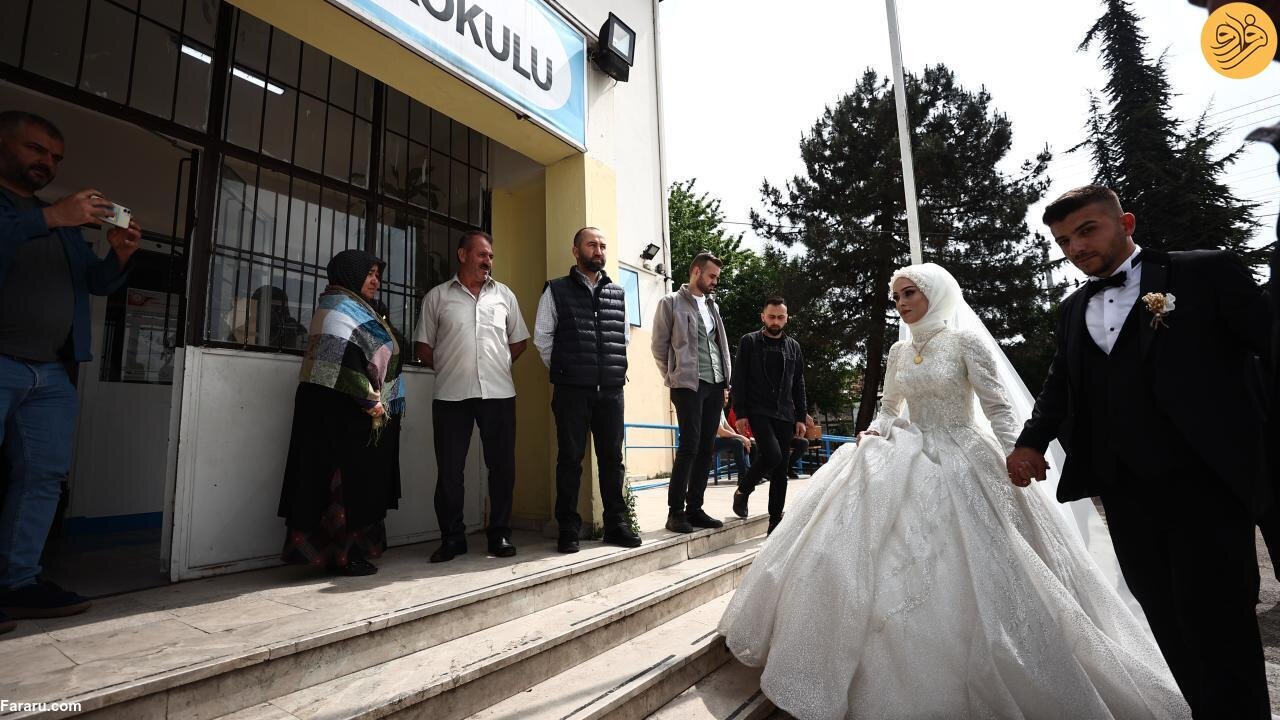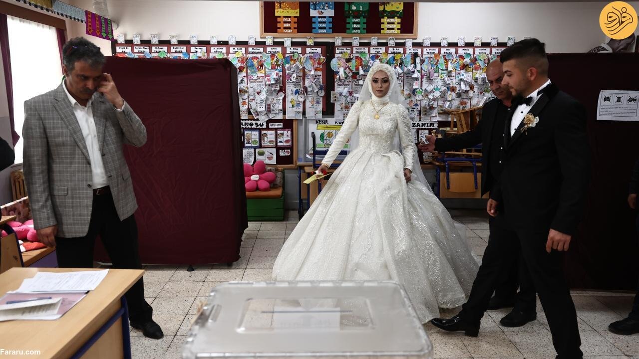 عروس و داماد ترکیهای که قرار بود در منطقه دوزجه جشن عروسی خود را برگزار کنند پیش از برگزاری مراسم با لباس مراسم خود برای شرکت در دور دوم انتخابات ریاست جمهوری ترکیه پای صندوقهای رای رفتند.