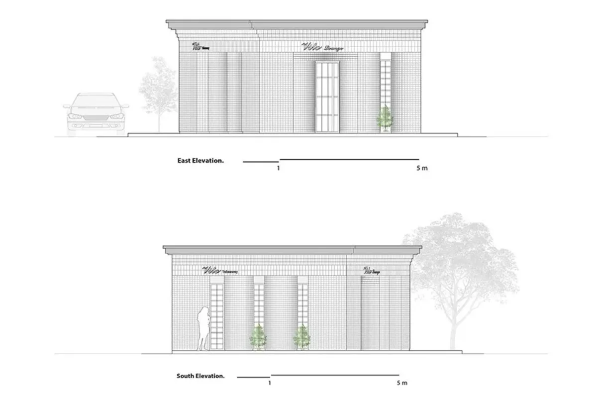 فرم منحنی دیوارها به شکلی کار شده است که هم در نمای ساختمان به کمک عمق ایجاد شده در انتهای منحنیها، به سایه اندازی و کنترل نور خیرهکننده خورشید بیانجامد، و هم به چیدمان فضای داخلی کافه و موقعیت قرارگیری میزها کمک کند. سقف کاذب کافه بهکمک مصالح نی خوزستان و با تزییناتی که یادآور جزئیات مضیفهای نیئین میباشد، اجرا شد. برای پوشش کانتر از آجرهای لعابدار قرمز و دیوار پشت کانتر نیز آجر رنگ گلبهای استفاده شده است.