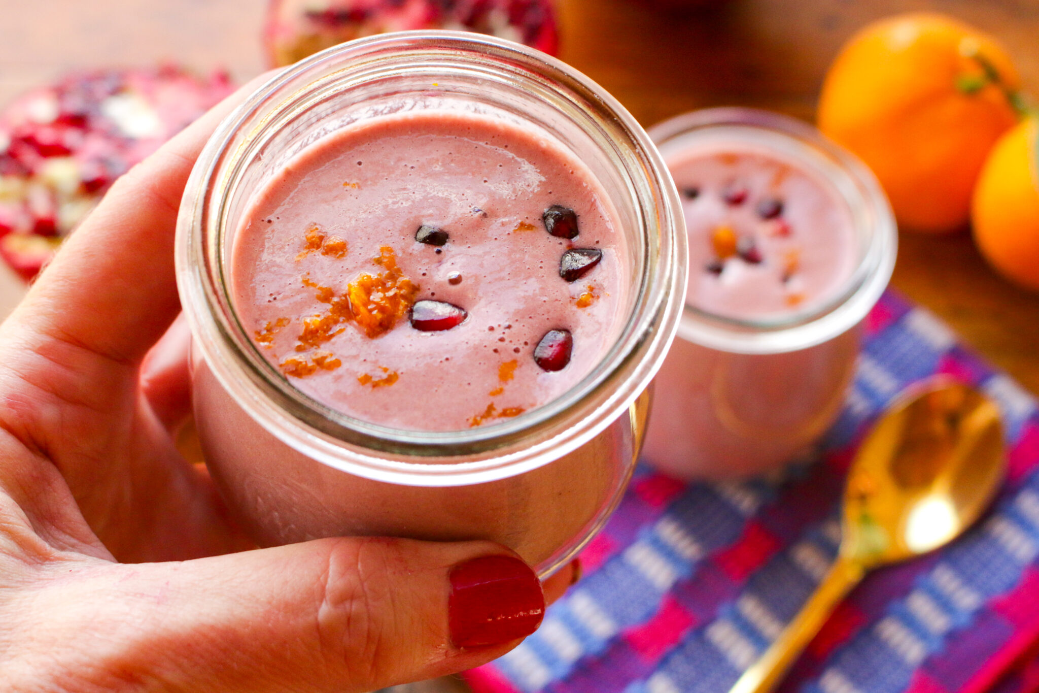 این آب انار به آرامی به بخش پایینی لیوان میرود و ظاهر اسموتی را به صورت دو رنگ در میآورد.