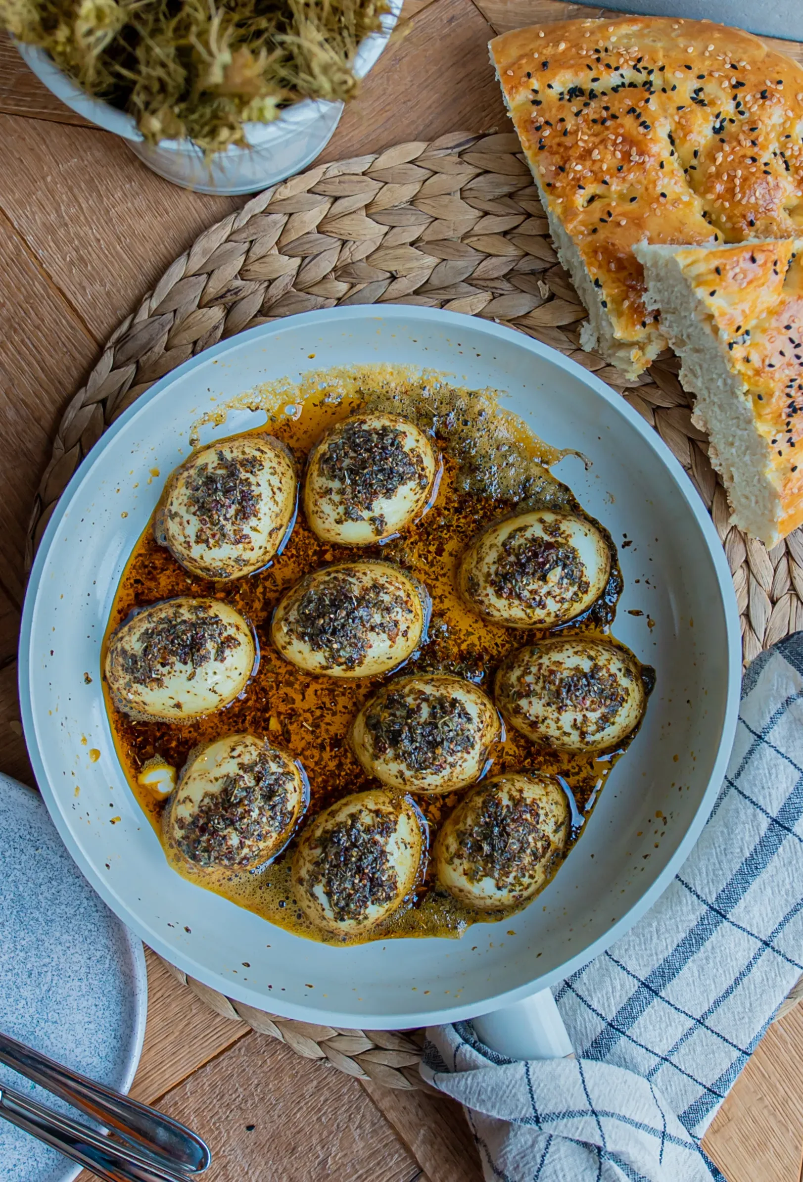 برای آماده کردن این صبحانه، تخم‌مرغ‌های آبپز را از وسط نصف کنید و آن‌ها را در ماهیتابه‌ای که در آن کره، نعناع خشک و ادویه‌ها را تفت داده‌اید بچینید تا یک طرف آن کاملا سرخ شود.