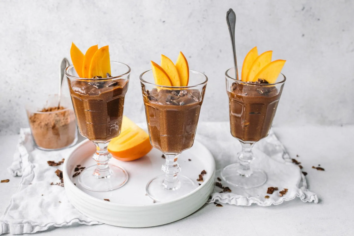 برای تزیین روی دسر می‌توانید از کمی پودر کاکائو و چند برش خرمالو استفاده کنید، نوش جان.