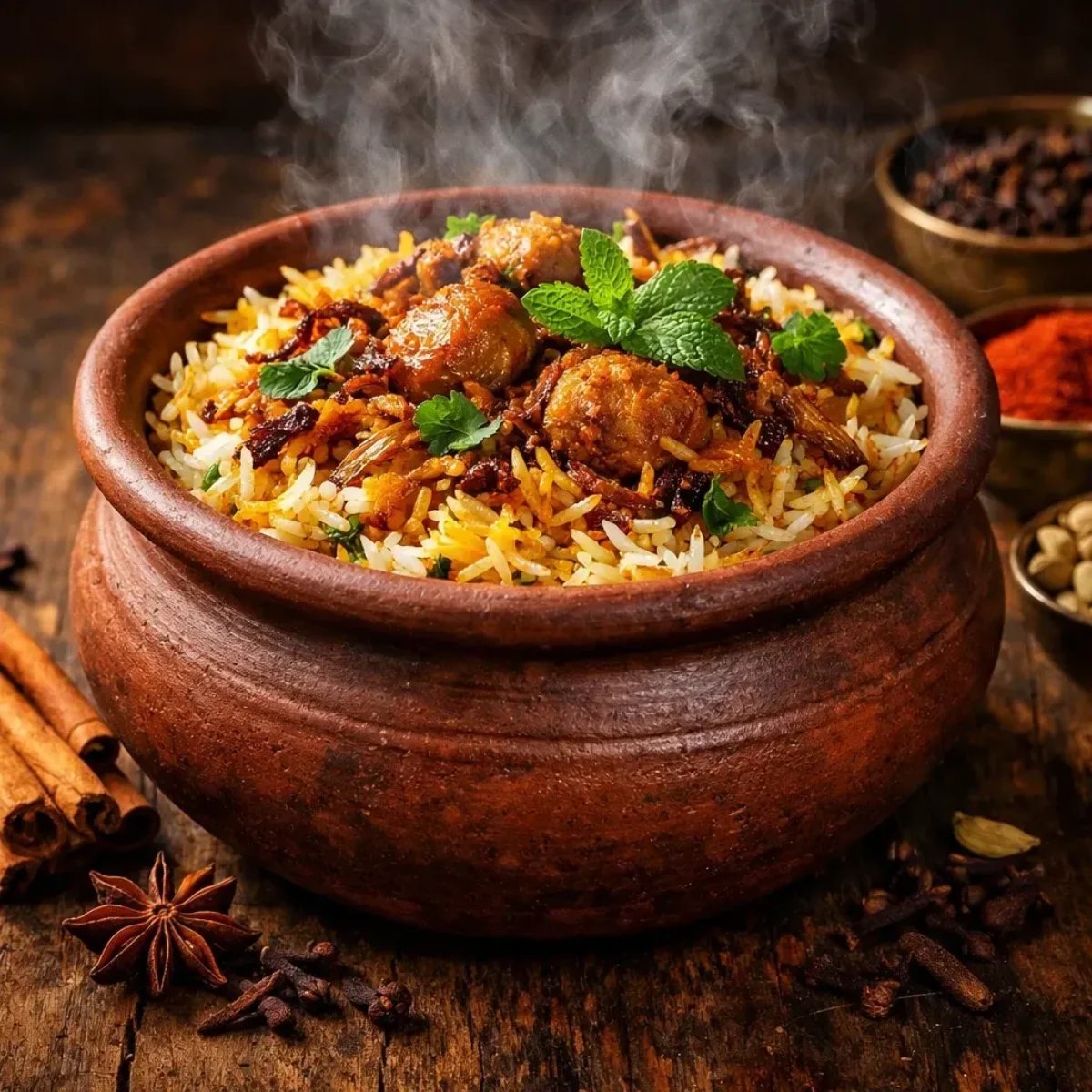 بریانی یکی از غذاهای کلاسیک و پرطرفدار جنوب آسیاست که ریشه در آشپزی مغولی دارد. این غذا ترکیبی از برنج باسماتی، گوشت یا مرغ، ماست، ادویههای تند و گیاهان معطر است که در لایههایی بخارپز میشود. نسخه حیدرآبادی این غذا، که از شهر حیدرآباد در هند سرچشمه گرفته، بهعنوان یکی از اصیلترین و خوشطعمترین انواع بریانی شناخته میشود.