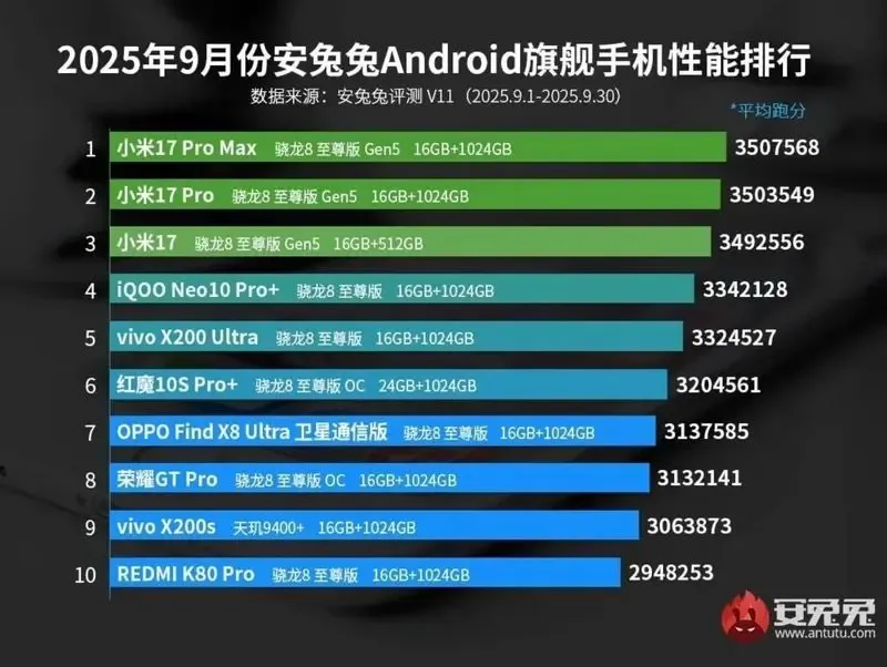 گزارش رسمی Antutu برای سپتامبر ۲۰۲۵ نشان می دهد که سری ۱۷ شیائومی صدر جدول قدرتمندترین گوشی‌های اندرویدی جهان را در اختیار دارند.