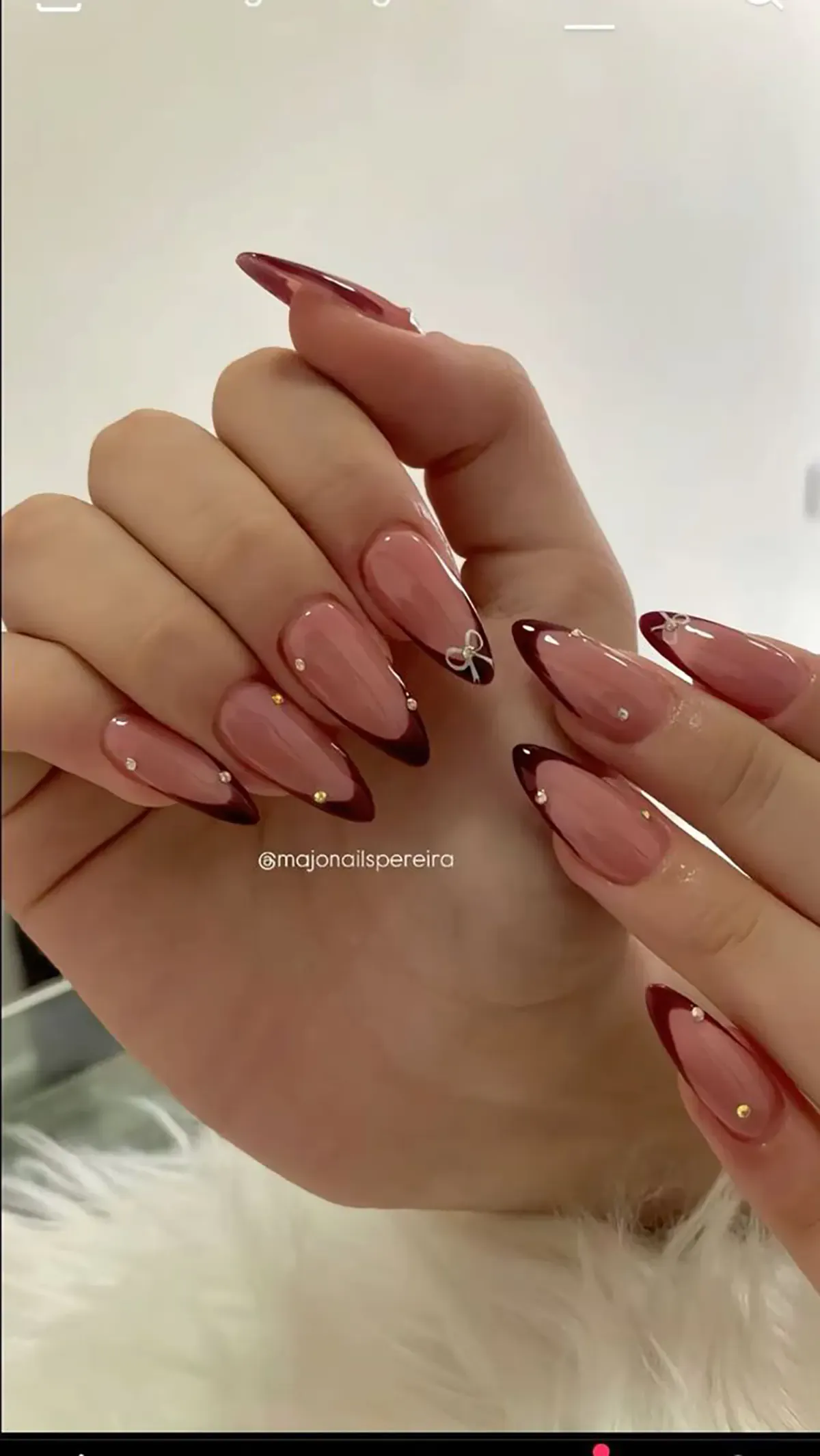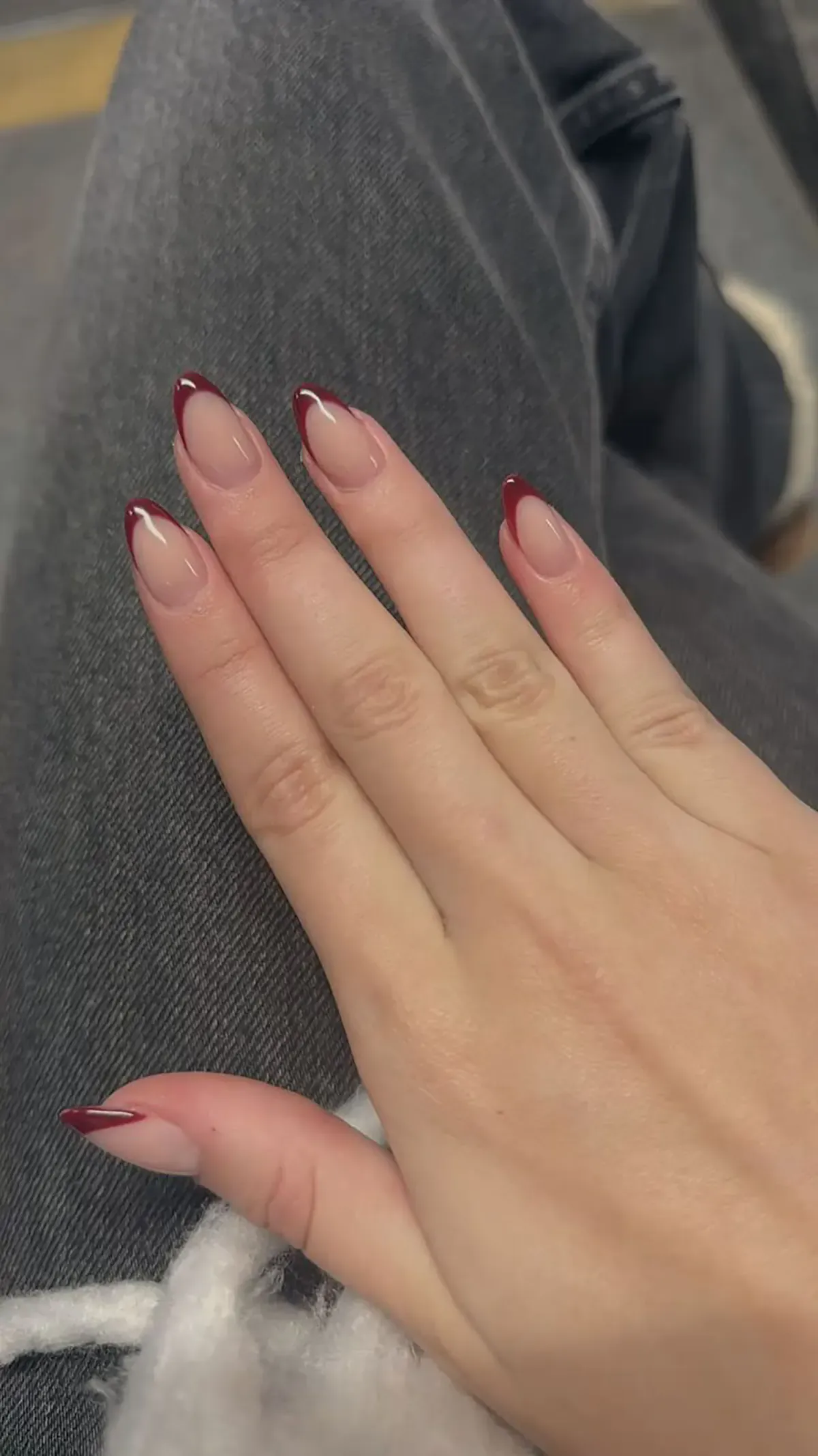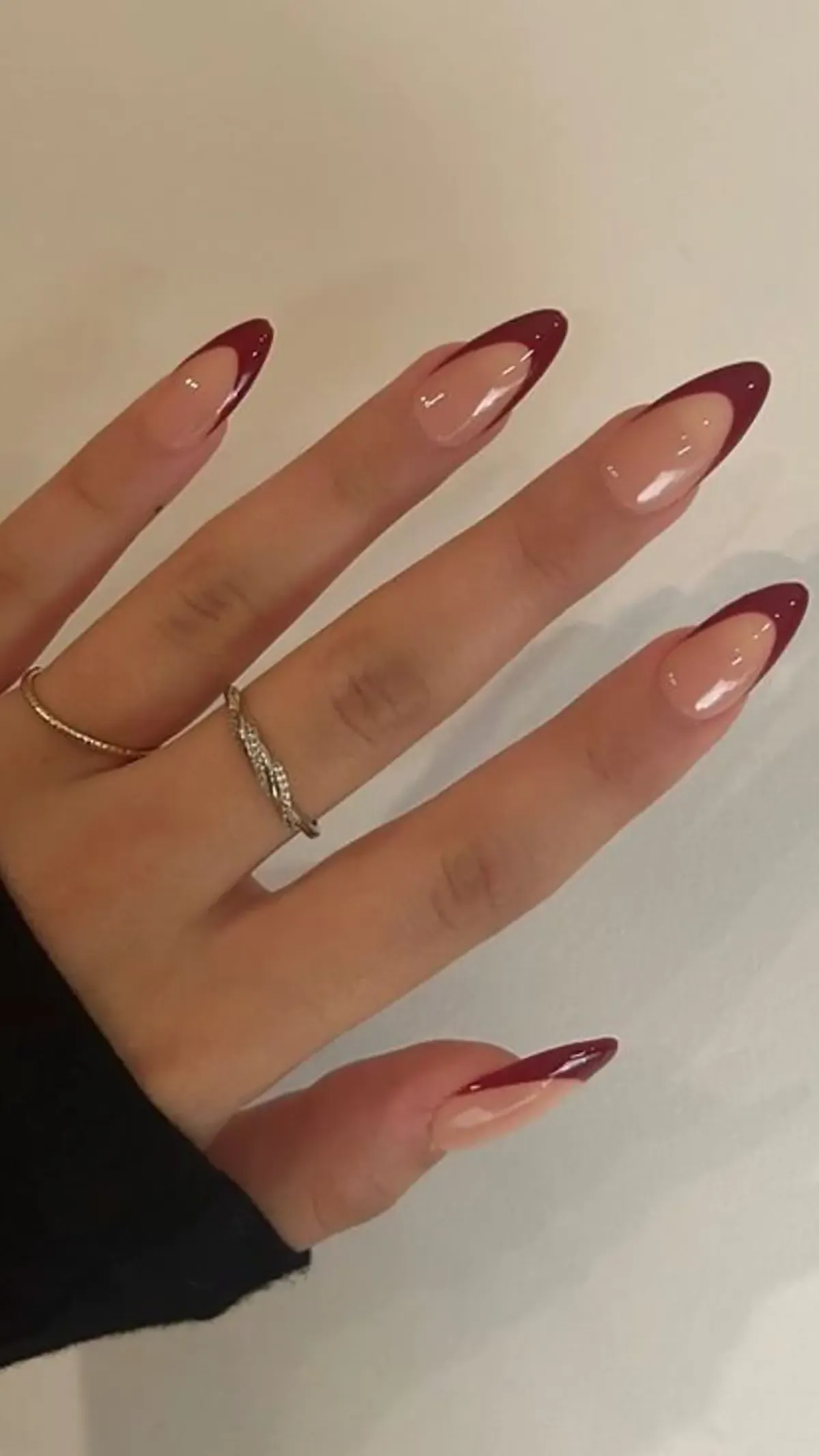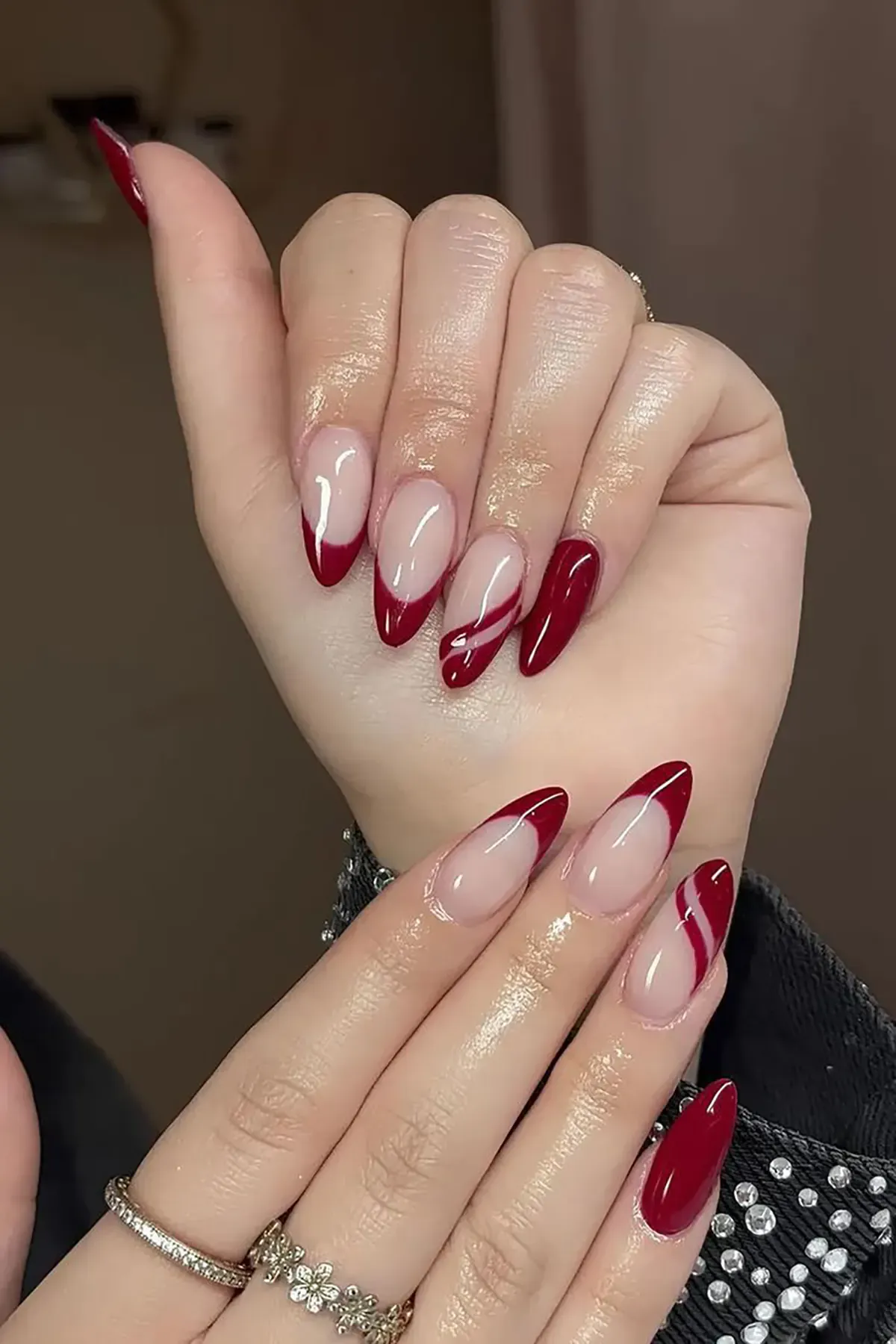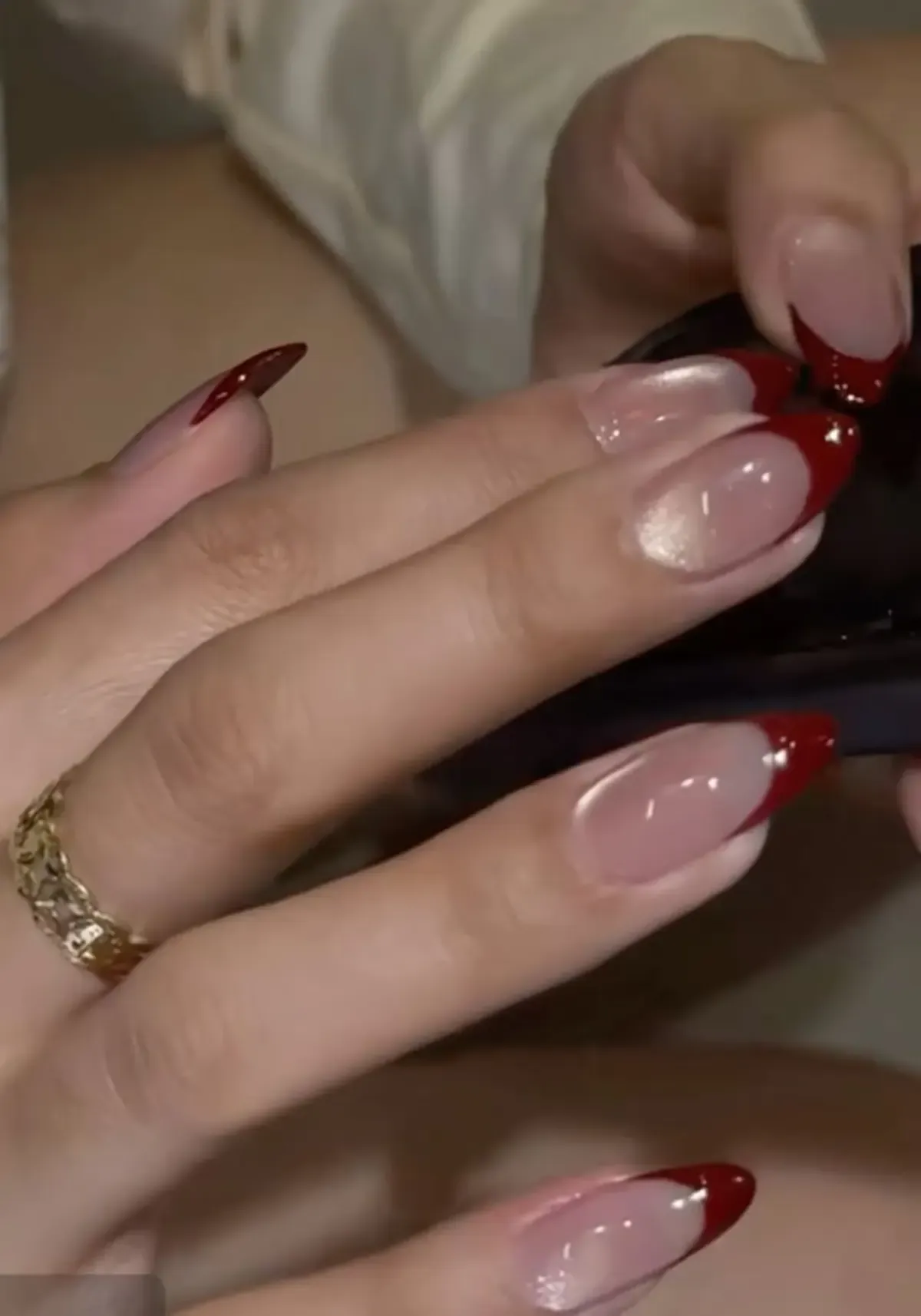 حالا اگه به درخشش و برق ناخن علاقه داری، مدل فرنچ قرمز شاین دقیقاً همون چیزیه که دنبالش بودی. این مدل، همون فرنچ کلاسیکه، ولی نوک ناخن‌ها با لاک قرمز براق یا گلیتری طراحی می‌شن و حسابی جلوه‌گر می‌شن.