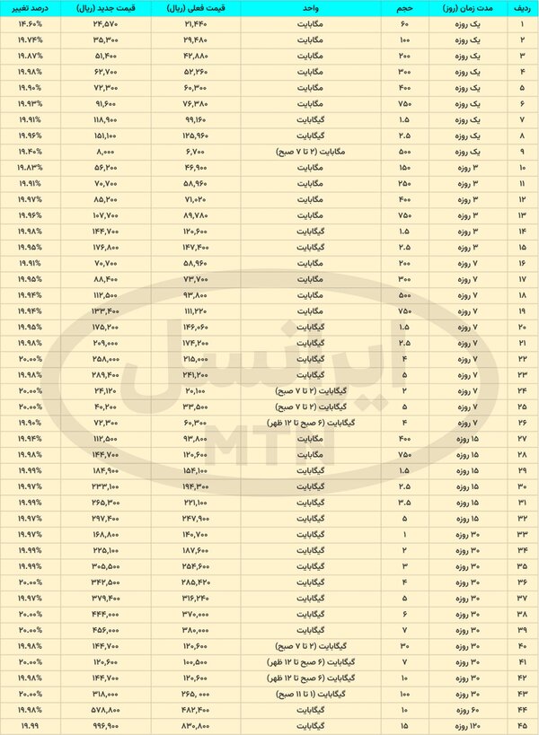 گفتنی است که بستههایی که پیش از این خریداری شدهاند، بدون تغییر تا پایان دوره اعتبار خود فعال خواهند بود. همچنین تعرفه پایه اینترنت همراه (تعرفه مصرف آزاد) تغییری نکرده