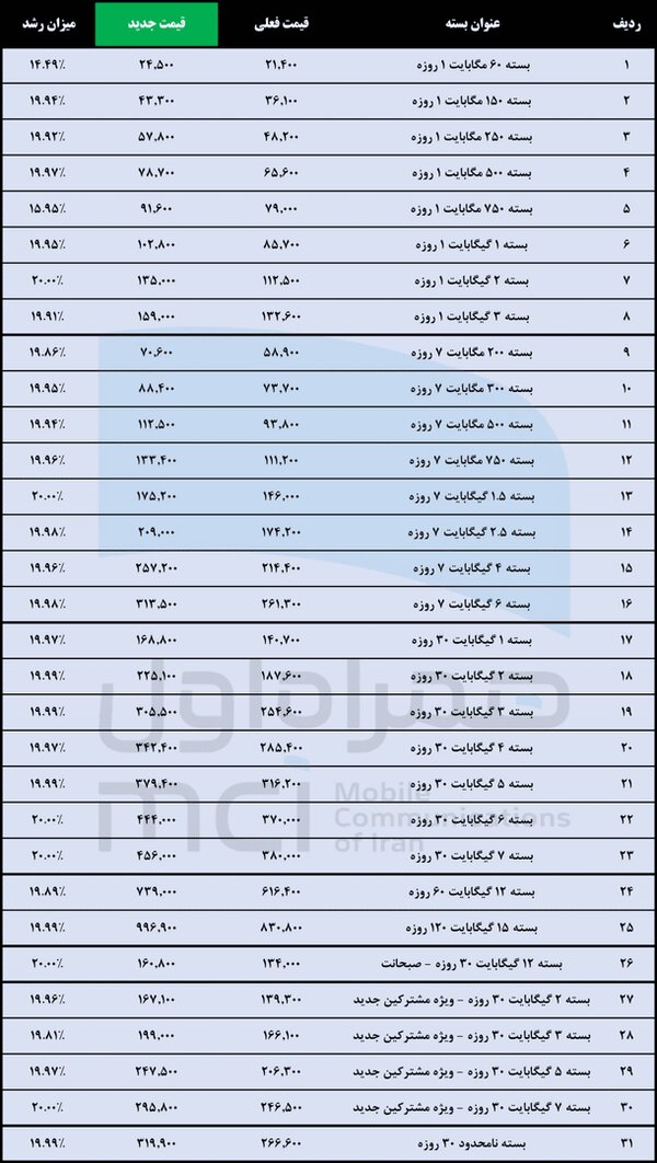 از امروز با تصمیم نهادهای تنظیمگر تعرفه بستههای اینترنت همراه تا سقف ۲۰ درصد افزایش یافته است.