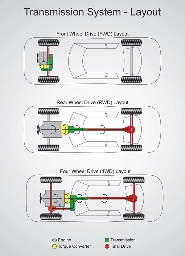گفتیم که پس از تولید قدرت در موتور خودرو، نیرو از طریق دیفرانسیل به چرخها منتقل میشود. سازنده خودرو فارغ از محل قرارگیری موتور خودروی خود (چه در جلو مانند سدانها یا عقب مانند سوپراسپرتها) میتواند قدرت را به چرخها جلو یا عقب منتقل کند. انتقال قدرت به چرخهای جلو مزایای مهمی دارد که باعث شده از این سیستم در خودروهای بسیار زیادی مانند نمونههای اقتصادی و… استفاده شود.