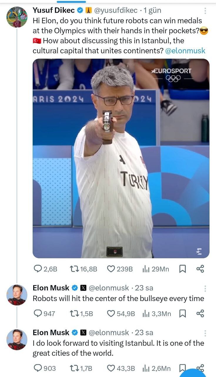 او در این پیام نوشت:«سلام ایلان، فکر می‌کنی ربات‌های آینده می‌توانند دست در جیب، مدال المپیک را ببرند؟ چطور است درباره این موضوع در استانبول، پایتخت فرهنگی که قاره‌ها را به هم متصل می‌کند، بحث کنیم؟» ایلان ماسک هم در پاسخ به این دعوت، گفت: مشتاق سفر به استانبول هستم. استانبول یکی از بزرگ‌ترین شهرهای جهان است.»