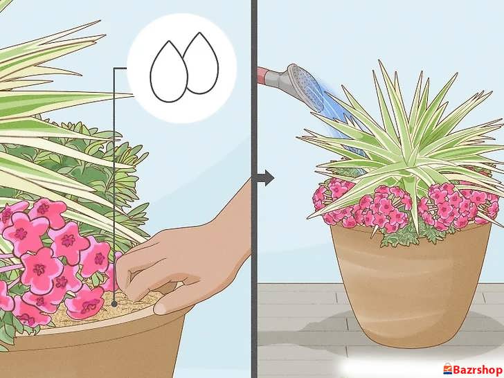 بلافاصله پس از کاشت، گلدان را آنقدر آبیاری کنید تا آب از سوراخ های زیر آن خارج شود. این کار شوک انتقال را کاهش می دهد.