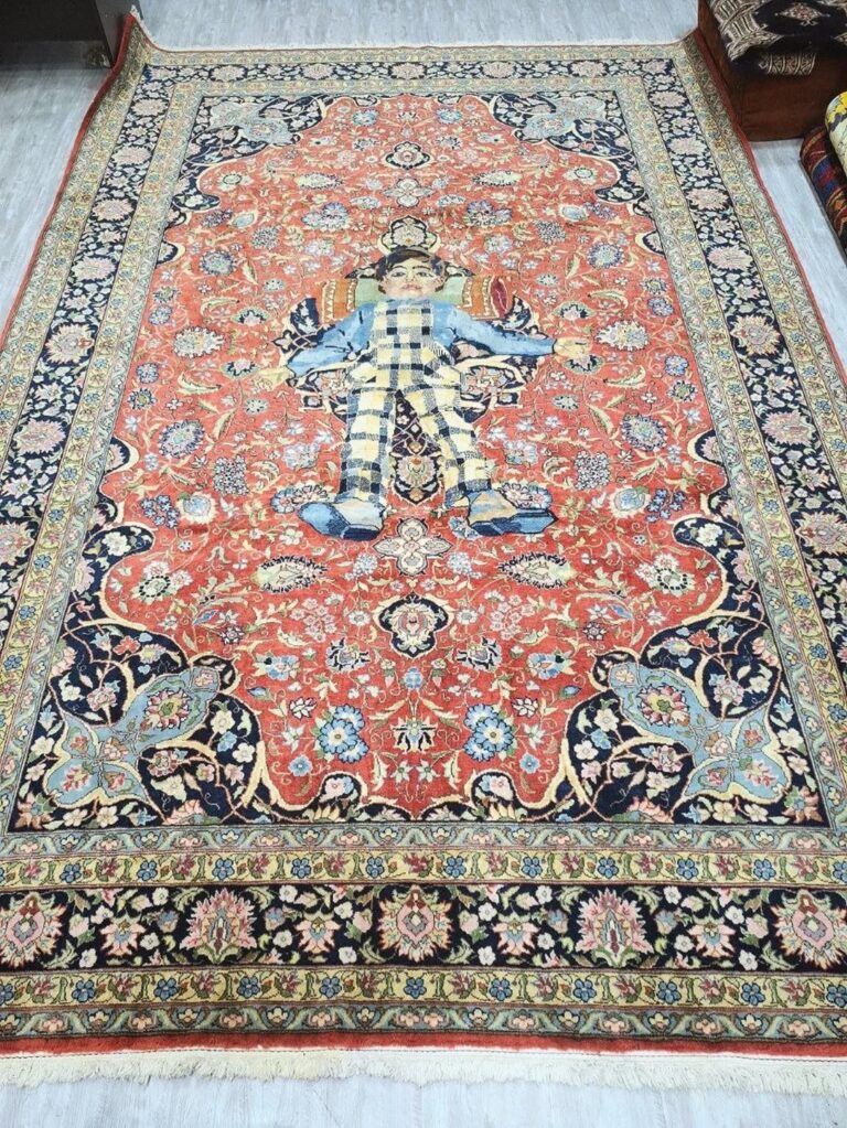 گلهای شاهعباسی، ختاییها، اسلیمیها و شاخهگلهای ظریف که با نظمی دقیق، روی زمینهای سرخ و حاشیههایی اصیل نشستهاند. اما آنچه این فرش را از بسیاری نمونههای مشابه جدا میکند، نقش مرکزی آن است؛ تصویری از یک کودک، در حالتی آرام و خوابگونه، که در دل این جهان پرنقشونگار جای گرفته است.