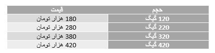 در عین حال در زمان ثبت نام متقاضی باید یکی از بسته‌های حجمی زمانی را نیز انتخاب کند که شرح این بسته‌های ماهانه در جدول زیر قابل مشاهده است: