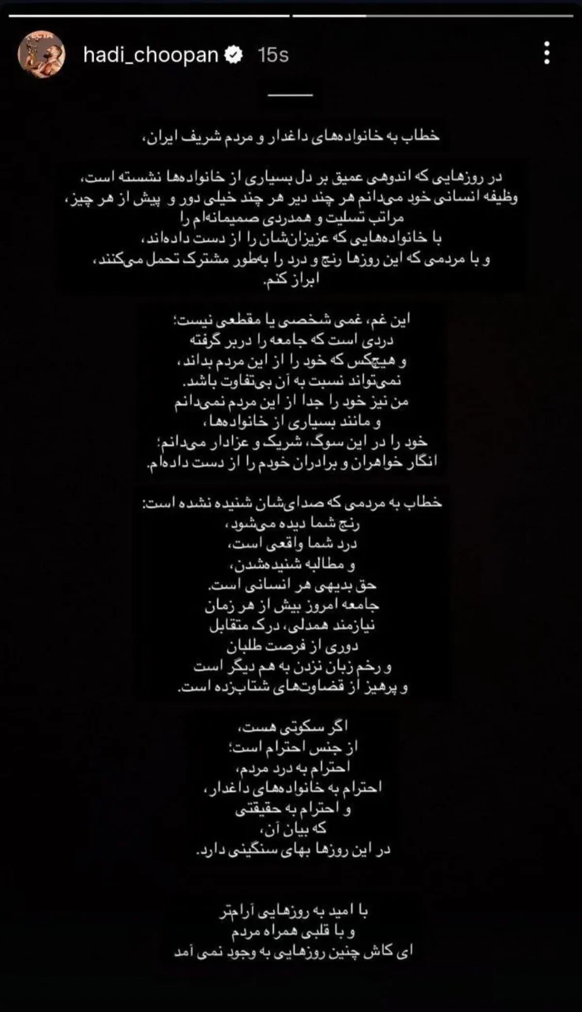 خطاب به مردمی که صدایشان شنیده نشده است رنج شما دیده میشود درد شما واقعی است و مطالبه شنیده شدن حق بدیهی هر انسانی است. جامعه امروز بیش از هر زمان نیازمند همدلی درک متقابل دوری از فرصت طلبان و رخم زبان نزدن به هم دیگر است و پرهیز از قضاوتهای شتاب زده است.